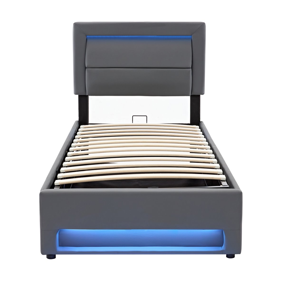 Cama tapizada 90 x 190 cm con diseño multifuncional que incluye puerto USB compatible con carga inalámbrica y por cable, iluminación LED regulable en 12 colores mediante mando a distancia y amplio espacio de almacenamiento bajo la cama. Su estructura con somier de lamas de 5 cm proporciona soporte estable y uniforme, garantizando un descanso cómodo y prolongando la durabilidad del mobiliario. Ideal para mantener el dormitorio ordenado, con montaje rápido y sencillo.