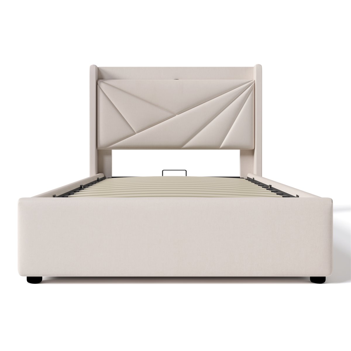 Disfruta de un descanso cómodo y funcional con esta cama individual tapizada de 90x200 cm, diseñada especialmente para habitaciones juveniles. Su cabecero geométrico con tejido de lino y relleno de espuma suave aporta un estilo moderno y confortable. Incorpora un práctico sistema de carga USB y tipo C directamente en el cabecero, ideal para mantener tus dispositivos siempre cargados. La estructura metálica robusta soporta hasta 150 kg, mientras que las láminas de madera elástica ofrecen un soporte ergonómico para un sueño reparador. Además, su espacioso arcón debajo del somier proporciona almacenamiento extra para ropa de cama, manteniendo la habitación organizada y libre de desorden. La combinación de materiales seguros y textiles certificados según Öko-Tex Standard 100 garantiza un entorno libre de sustancias nocivas y apto para personas alérgicas.