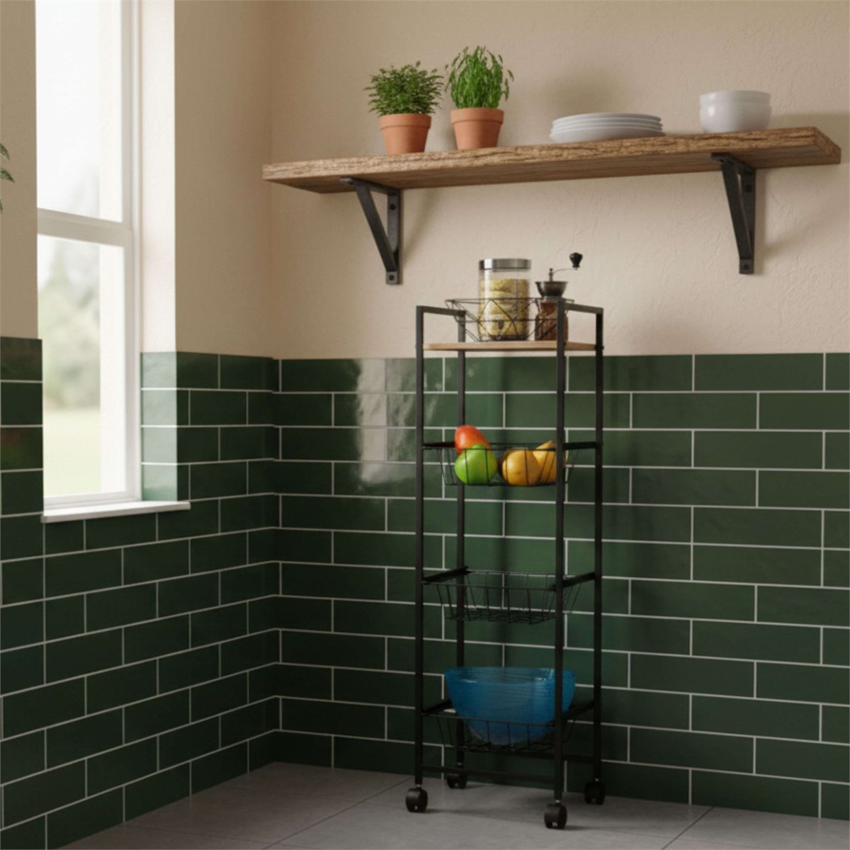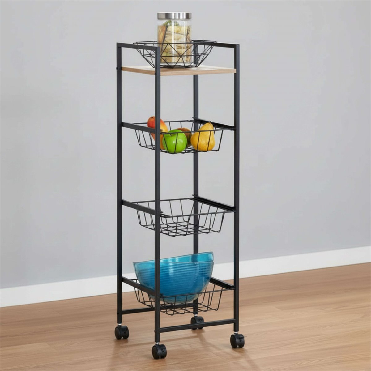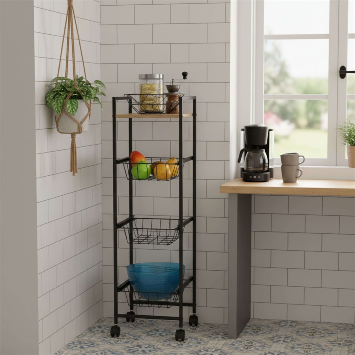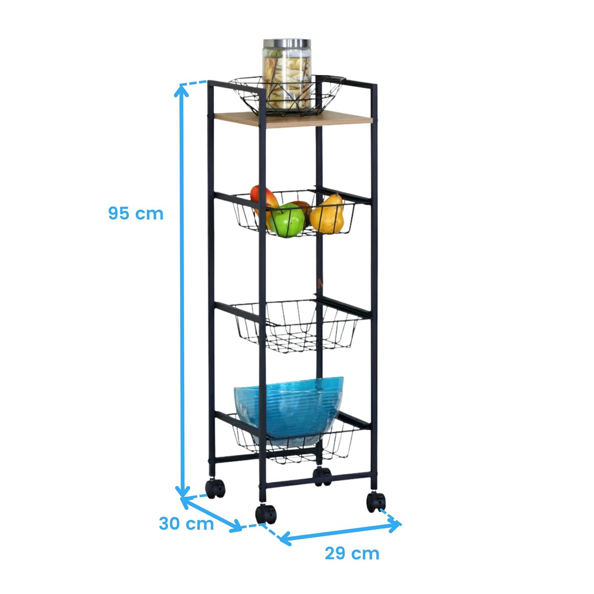 El carrito auxiliar frutero en colores negro y roble cambrian agrega un toque moderno y acogedor a tu cocina, destacando por su combinación de madera clara y negro que proporciona un aire contemporáneo y distintivo. Su presencia visual impacta favorablemente en el espacio, generando una atmósfera actual y organizada. Esta pieza no solo ofrece un espacio ordenado, sino que también complementa y embellece la decoración, dando un carácter único a la estancia. Fabricado en melamina, un material ideal para muebles gracias a su resistencia y acabado atractivo, el carrito auxiliar frutero incluye una estructura de metal robusta, ruedas que ofrecen movilidad versátil en cualquier espacio y una balda superior para mayor almacenamiento. Sus 3 cestos proporcionan un almacenamiento eficaz para productos frescos. No dejes pasar la oportunidad de adquirirlo y optimizar el almacenamiento en tu cocina de manera práctica y sencilla. Medidas: Ancho: 29 cm, Alto: 95 cm, Profundidad: 30 cm. Se trata de mobiliario con kit de montaje, que incluye manual de instrucciones y tornillería.