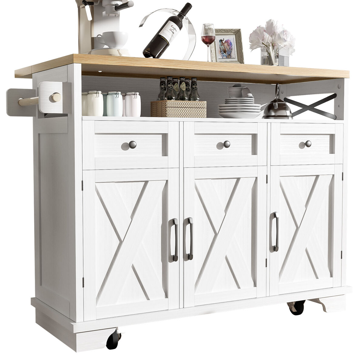 El atractivo diseño de la puerta complementa el estilo general del carrito de comida, realzando su atractivo visual y permitiéndole integrarse a la perfección en diversos espacios. Un toallero de roble y un exclusivo adorno de hierro en forma de X en el lateral realzan la estabilidad y belleza del producto.