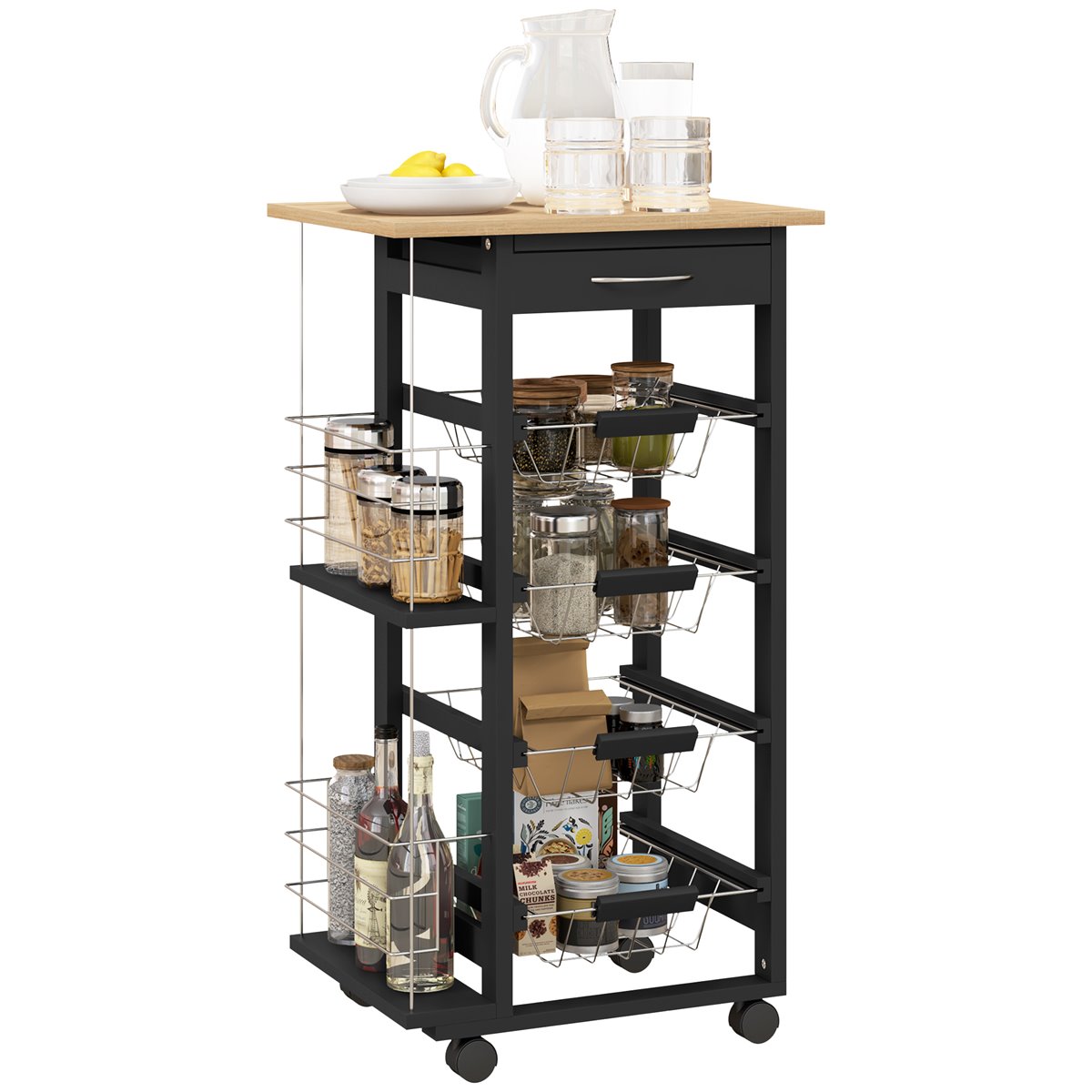 Este carrito auxiliar de cocina de HOMCOM te ayudará a mantener todo en orden. Con una estructura de MDF y madera de pino, ofrece un almacenamiento versátil gracias a su cajón, estantes laterales y cestas metálicas extraíbles. Su diseño compacto es perfecto como carrito verdulero y su encimera resulta útil para preparar alimentos. Las cuatro ruedas giratorias permiten moverlo y colocarlo fácilmente donde lo necesites en tu cocina.