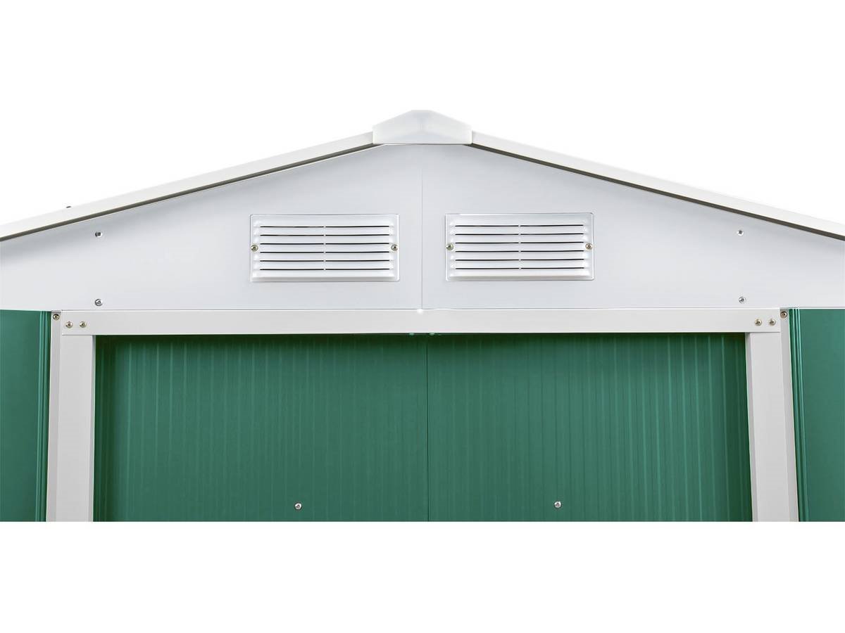 Para evitar los malos olores y la degradación de sus enseres, la caseta de jardín metálica Rosas está equipada con 4 rejillas de ventilación.
