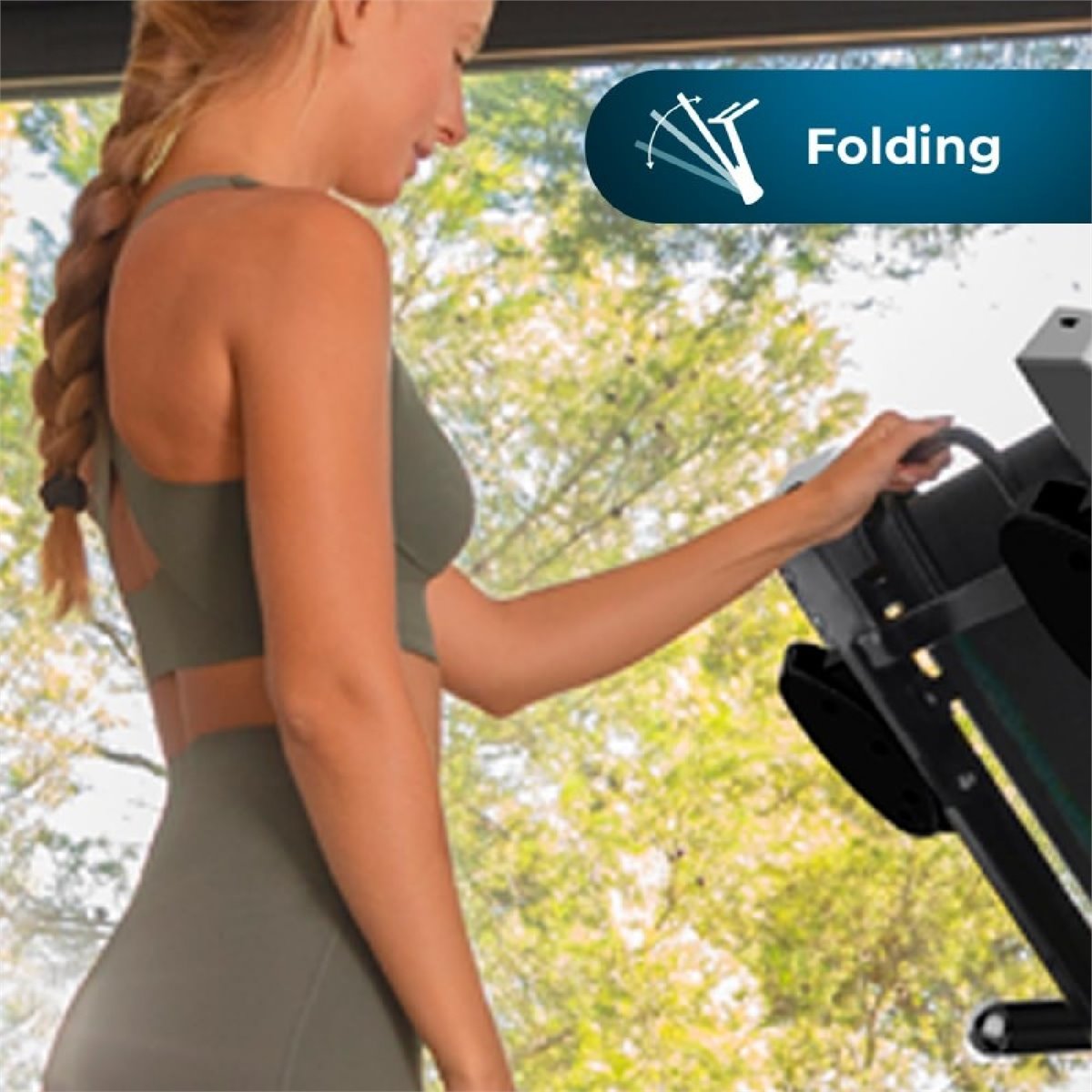 Cinta de andar plegable con potencia de 550W / 0,75 CV. De 1 a 8 Km/h. 12 programas predefinidos. Panel de control LCD. Superficie de carrera 100 x 40 cm. Con ruedas de transporte, entrada de audio, altavoces, portabotellas y soporte para tablet. Peso máximo permitido: 120 Kg. Potencia de motor de 550 W.