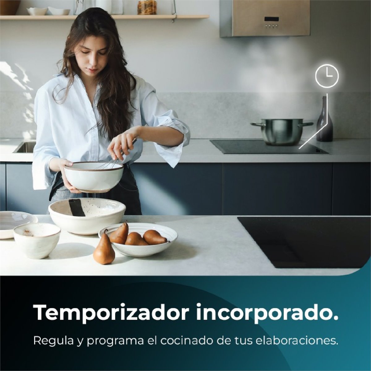 La seguridad es una prioridad con el bloqueo para niños, que evita el uso accidental de la placa, brindando tranquilidad a las familias. Además, el temporizador integrado facilita la programación del tiempo de cocción, ayudándote a conseguir siempre el punto exacto en tus recetas. El sistema Keep Warm mantiene tus alimentos a la temperatura ideal sin riesgo de sobrecocción, mientras que el detector de sartenes asegura que la placa solo funcione cuando hay un utensilio adecuado sobre ella, evitando accidentes y desperdicios de energía. El indicador de calor residual te alerta cuando las zonas de cocción aún están calientes, previniendo quemaduras.