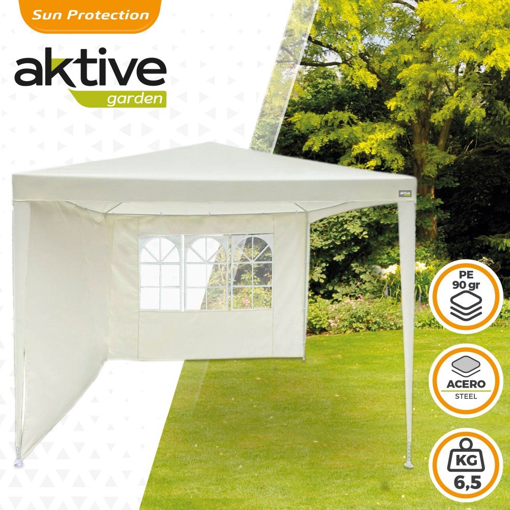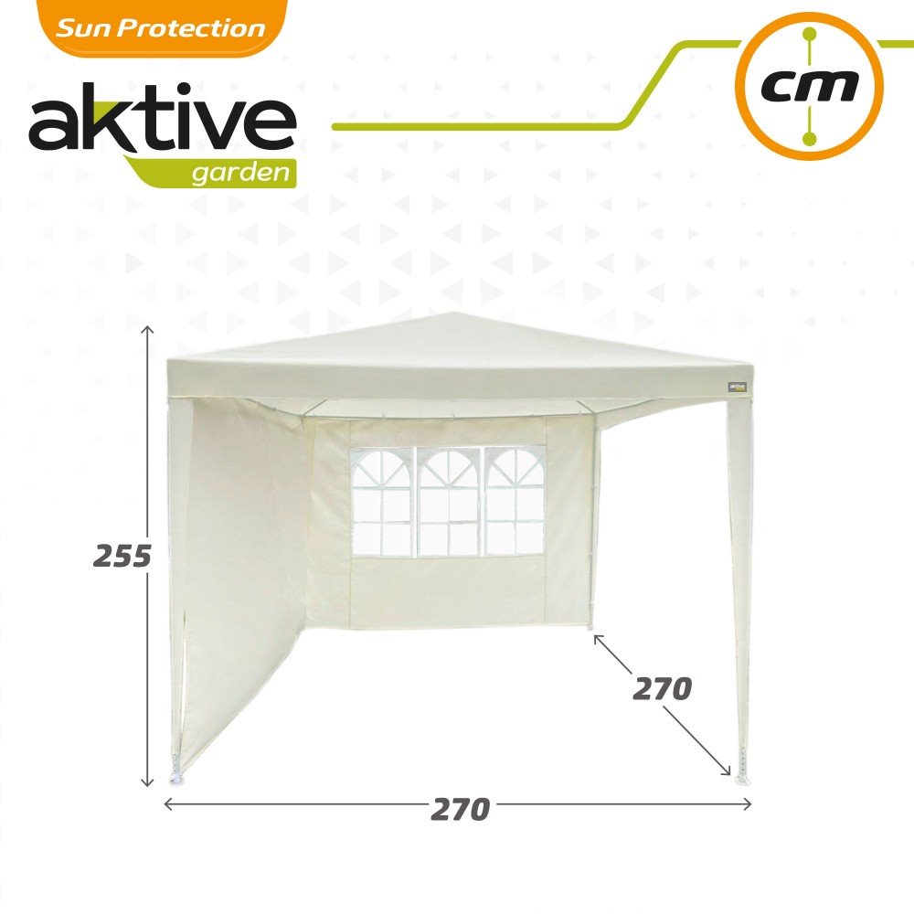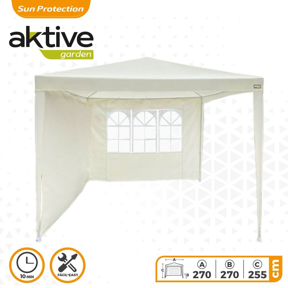 Cenador plegable Aktive Garden con dos paredes y ventana lateral para iluminar y proteger el interior. Crea un rincón acogedor en tu jardín o terraza con esta carpa color crema de 270 cm de ancho, 270 cm de largo y 255 cm de alto. Fabricada en tejido PE de 90 gramos resistente a la intemperie y con estructura de acero de 0,35 mm de grosor con tubos de 24 y 18 mm de diámetro que se ensamblan entre sí. Pesa 6,5 kg y se monta con facilidad en aproximadamente 10 minutos.