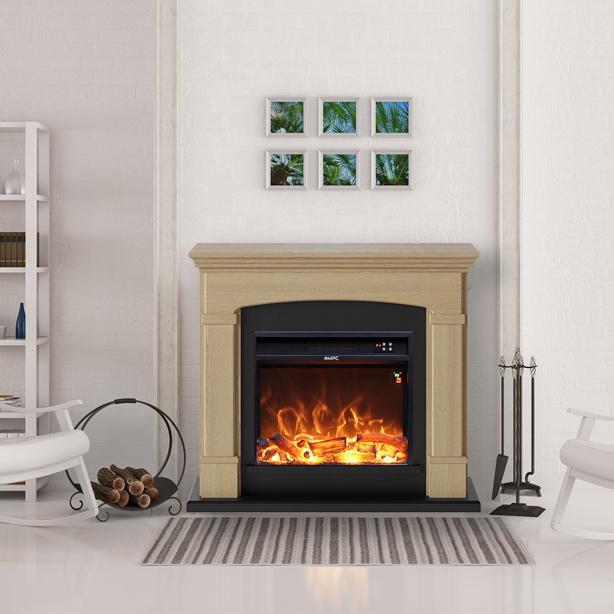 Chimenea de pie en el nuevo color roble natural, diseño limpio con bordes redondeados. La repisa de la chimenea presenta un acabado de roble multicapa, así como un delicado centro arqueado, columnas lisas y un marco central con bordes redondeados. La luz LED integrada es muy realista. La profundidad de sólo 25 cm hace que ahorre espacio, perfecto para cualquier habitación.