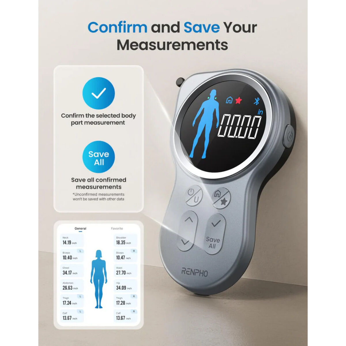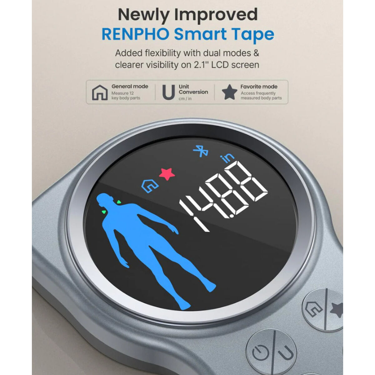 La Renpho SMART TAPE MEASURE+ es una avanzada cinta métrica inteligente diseñada para quienes buscan precisión y comodidad en el seguimiento de medidas corporales y objetos, integrando tecnología moderna en un formato compacto y funcional. Este modelo destaca por su elegante acabado en color gris y una pantalla LCD de gran tamaño y formato redondo, que facilita la lectura instantánea de los resultados, incluso en condiciones de poca luz. Equipada con conectividad Bluetooth, permite sincronizar fácilmente los datos recogidos con la aplicación RENPHO Health en dispositivos Android, ofreciendo así un registro digital seguro y detallado para el seguimiento de progresos personales, especialmente útil en contextos de fitness, salud y control de medidas. Su funcionamiento es intuitivo gracias al manual de instrucciones incluido, lo que la convierte en una herramienta accesible tanto para usuarios experimentados como para aquellos que exploran por primera vez las soluciones inteligentes para el hogar y la salud. Gracias a sus varios modos de medición, ofrece versatilidad para adaptarse a diferentes necesidades y preferencias, y su diseño robusto asegura durabilidad en el uso cotidiano. En resumen, la Renpho SMART TAPE MEASURE+ se posiciona como una solución eficiente e innovadora para quienes desean monitorizar medidas con precisión y comodidad, apoyados por tecnología inteligente y una conexión fluida con aplicaciones móviles.