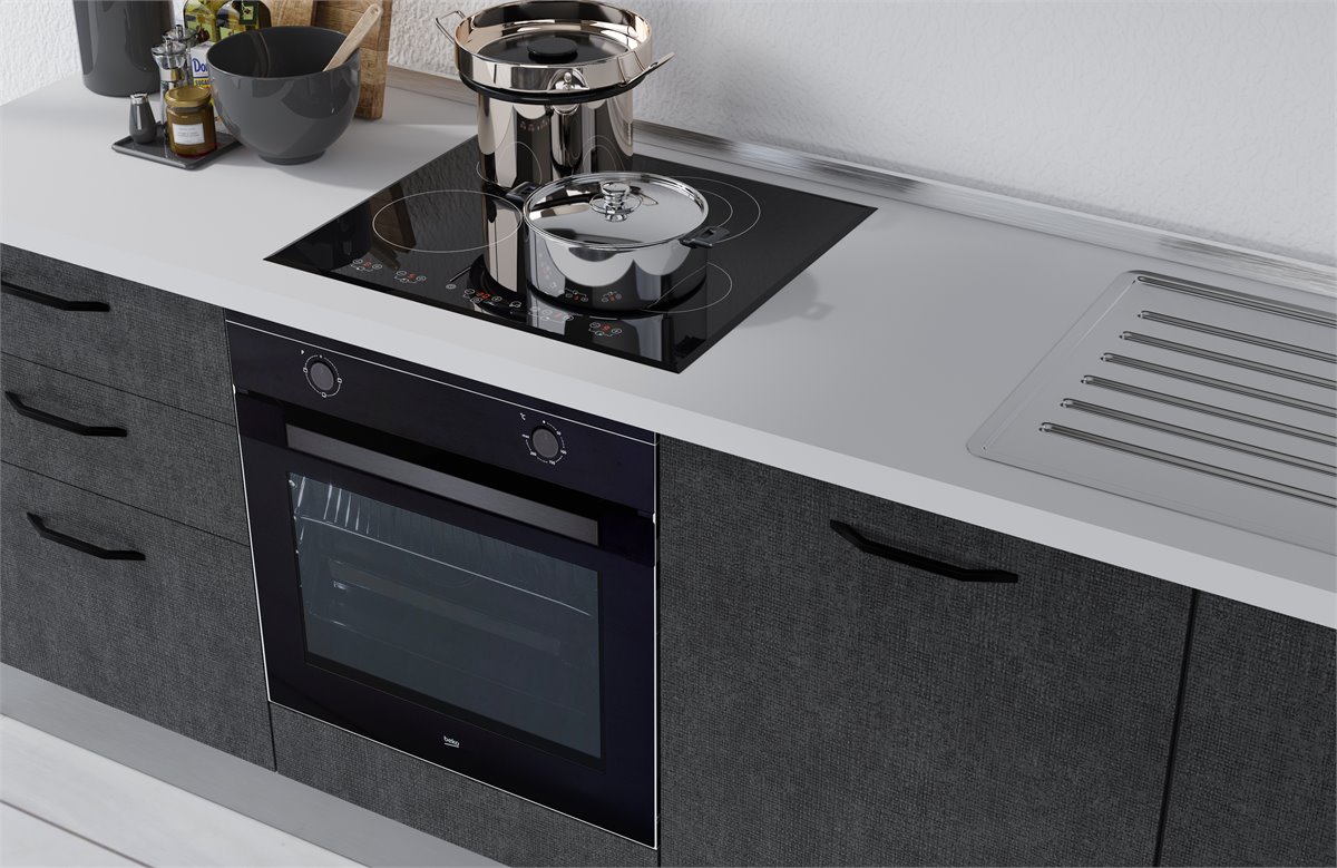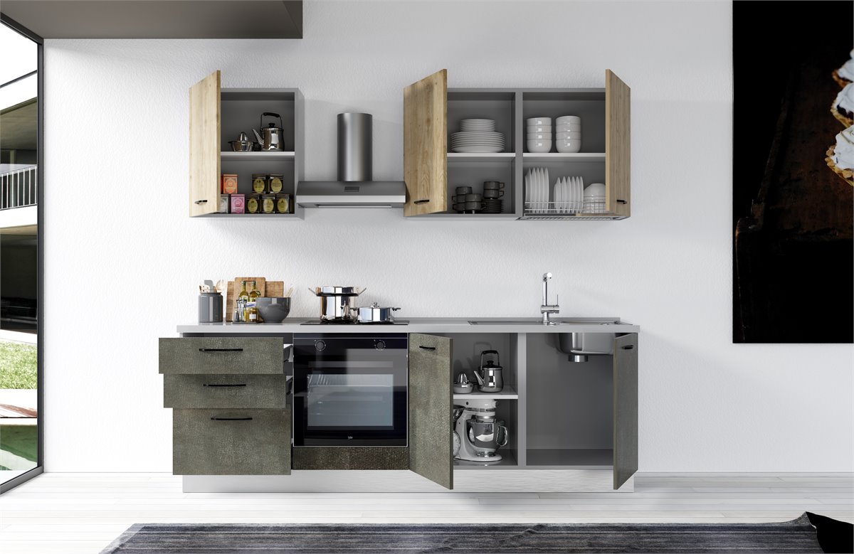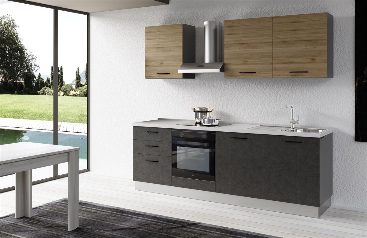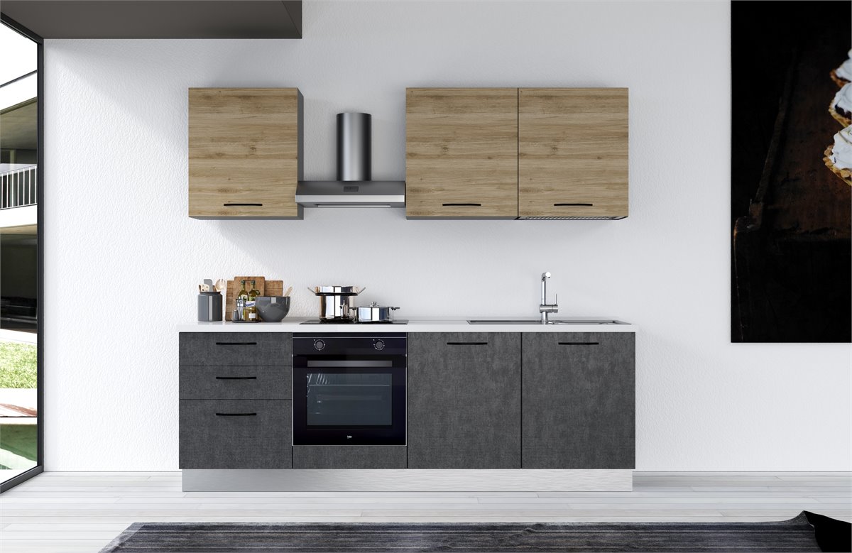Cocina GILDA 2.0 240x216 cm. Derecha. Acabado gris oscuro y madera. Consta de 7 módulos, fregadero, grifo, campana, placa y horno. Sus módulos están fabricados en panel de partículas. Puertas y cajones soft close. Se compone de base fregadero de 60cm, base de 60cm de 1 puerta, base para horno, base 60cm con 2 cajones y 1 cesta, unidad de pared de 60cm escurreplatos, 2 unidades de pared de 60cm. Campana extractora KUMTEL DK6-731. Eficiencia energética D (A+++ a D). 2 Motores. Potencia 140W. Capacidad de ventilación intensiva: 300 m3/h. Control mediante botones. 3 Velocidades. Filtro de aluminio lavable en lavavajillas, Iluminación led. La campana incluye el tubo / chimenea por encima del motor. Inox Medidas: 59,8 an x 15 al x 48,4 fon cm Placa vitrocerámica CANDY CH64XB: 4 Zonas de cocción. Control táctil. 10 Niveles de potencia. Temporizador. Color negro. Medidas: 59 an x 4 al x 52,6 fon cm. Horno convencional CANDY FIDCN200 con ventilador de enfriamiento. Eficiencia energética A (A+++ a D). 70 Litros de capacidad. Controles mecánicos. 4 Funciones. Limpieza aquactiva. Accesorios: 1 rejilla y 1 bandeja. Color negro: 59,5 an x 59,5 al x 56,8 fon cm.
