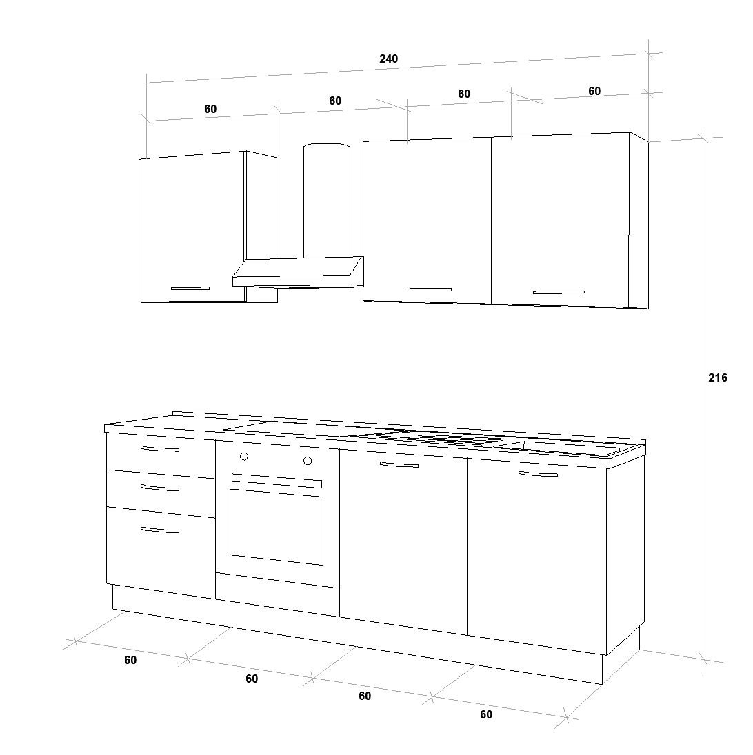 Cocina GILDA 2.0 240x216 cm. Derecha. Acabado madera y gris claro. Consta de 7 módulos, fregadero, grifo, campana, placa y horno. Sus módulos están fabricados en panel de partículas. Puertas y cajones soft close. Se compone de base fregadero de 60cm, base de 60cm de 1 puerta, base para horno, base 60cm con 2 cajones y 1 cesta, unidad de pared de 60cm escurreplatos, 2 unidades de pared de 60cm. Campana extractora KUMTEL DK6-731. Eficiencia energética D (A+++ a D). 2 Motores. Potencia 140W. Capacidad de ventilación intensiva: 300 m3/h. Control mediante botones. 3 Velocidades. Filtro de aluminio lavable en lavavajillas, Iluminación led. La campana incluye el tubo / chimenea por encima del motor. Inox Medidas: 59,8 an x 15 al x 48,4 fon cm Placa vitrocerámica CANDY CH64XB: 4 Zonas de cocción. Control táctil. 10 Niveles de potencia. Temporizador. Color negro. Medidas: 59 an x 4 al x 52,6 fon cm. Horno convencional CANDY FIDCN200 con ventilador de enfriamiento. Eficiencia energética A (A+++ a D). 70 Litros de capacidad. Controles mecánicos. 4 Funciones. Limpieza aquactiva. Accesorios: 1 rejilla y 1 bandeja. Color negro: 59,5 an x 59,5 al x 56,8 fon cm.