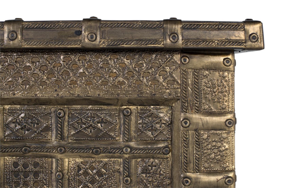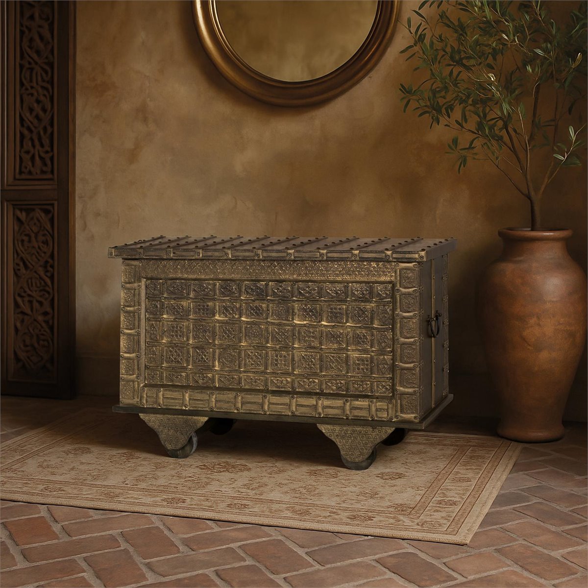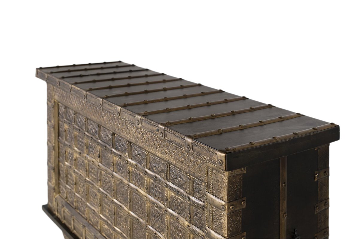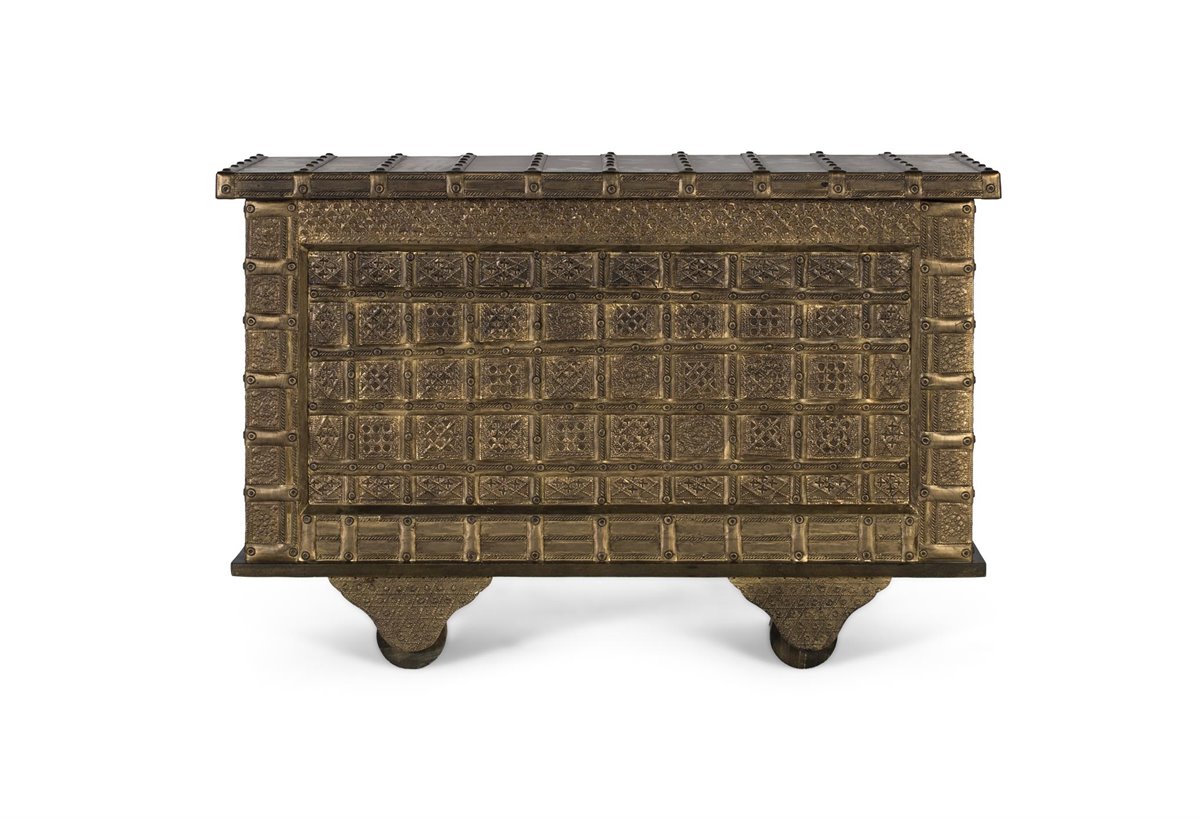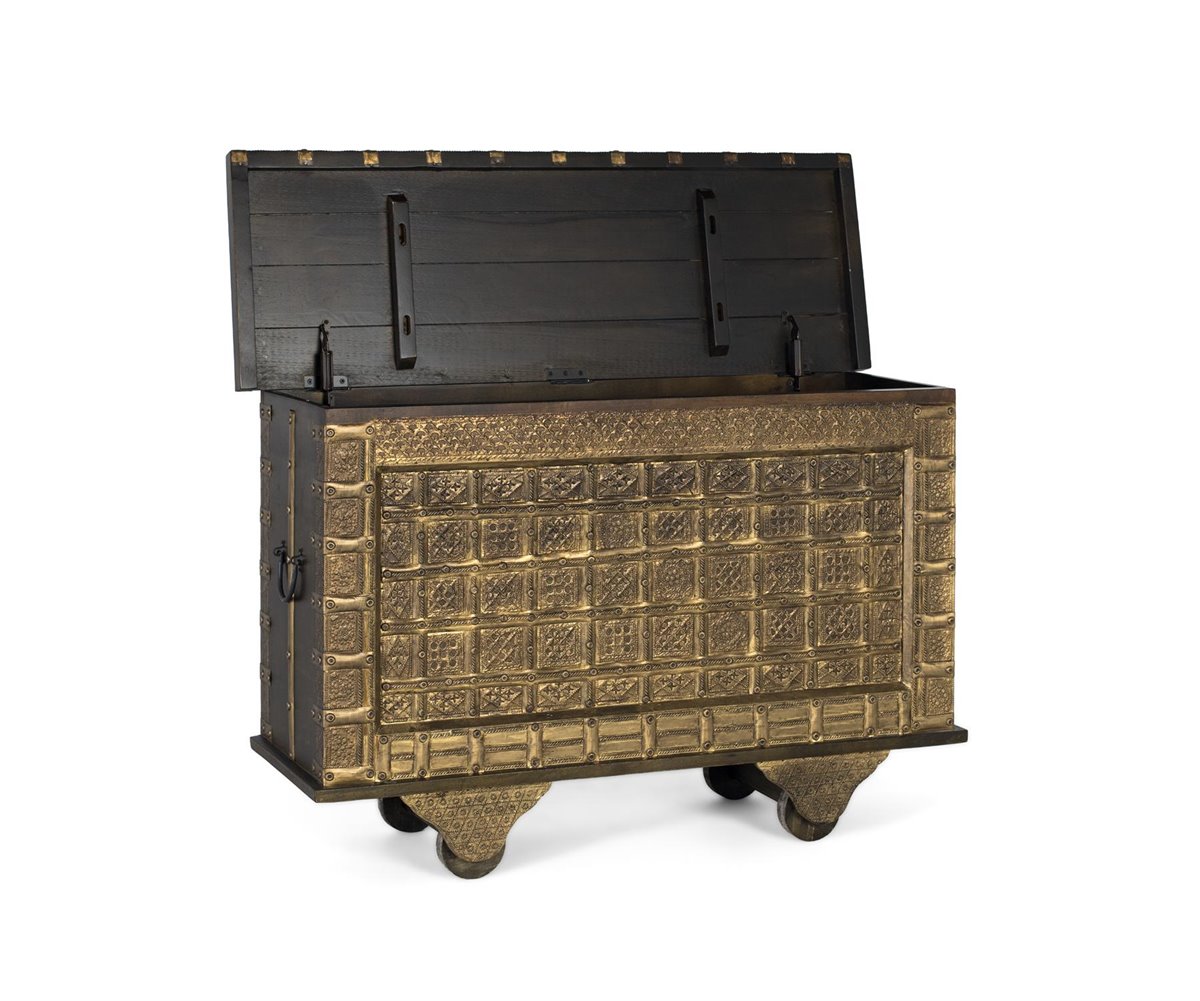 Este baúl antiguo está fabricado en madera maciza y decorado con láminas de latón repujado en patrones geométricos y florales. Tiene un acabado dorado envejecido que resalta su trabajo artesanal. A los costados cuenta con asas metálicas, y se apoya directamente sobre ruedas que permiten moverlo fácilmente. Es una pieza funcional y decorativa, ideal para espacios de estilo rústico, colonial o vintage. MEDIDA INTERIOR-57X106X32CM