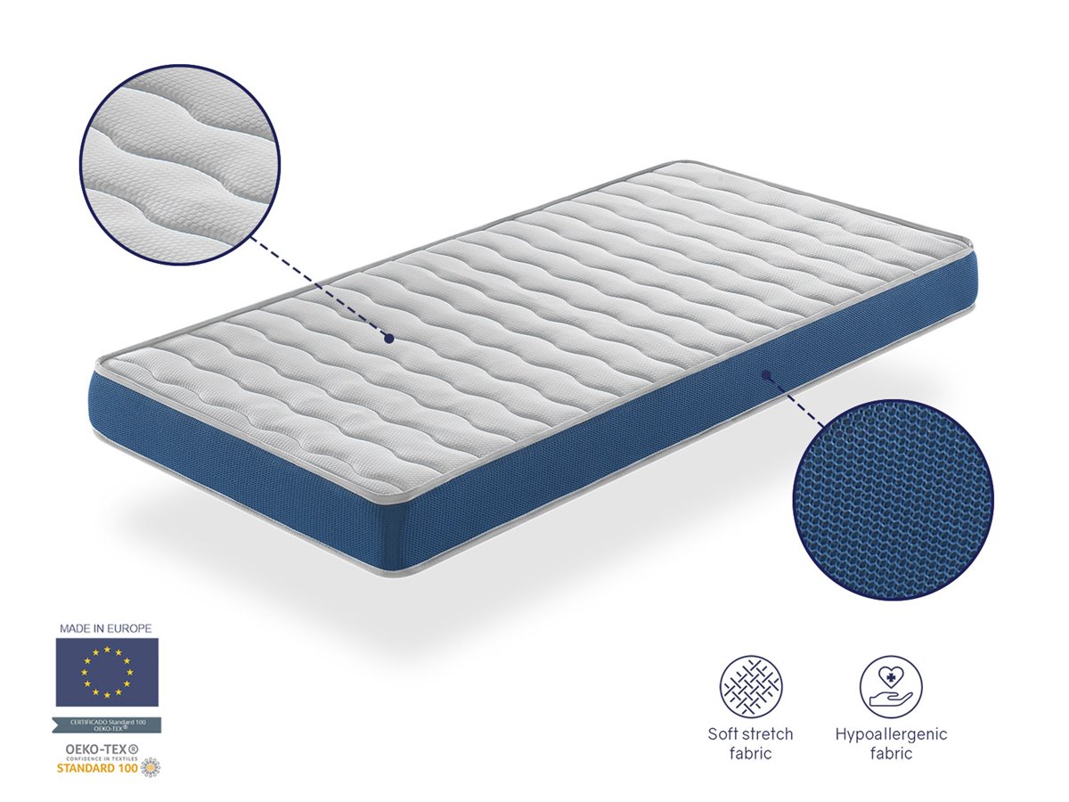 ❤️️ [FICHA TÉCNICA] La altura total: 11 cm Densidad: 23 kg/m2 Recomendada por pediatras Dimensiones: Disponible en diferentes medidas. Material del núcleo: Espuma de poliuretano con micro perforaciones de aireación Material exterior: 100% poliéster Edad recomendada: desde 0 a 36 meses, máximo 20 kg. Antibacteriano y certificado oekotex. 🛌 [SUEÑO CÓMODO Y REPARADOR] Durante las primeras etapas de crecimiento de nuestro pequeño, el descanso es una parte muy importante para su salud y vitalidad. El colchón Onix ha sido especialmente diseñado para adaptarse a las necesidades de nuestro bebé. Con acolchado con fibra hipoalergénica y su núcleo perforado permite una perfecta ventilación para mantener a nuestro bebé seguro y evitar la creación de bolsas de CO2. 🥇 [SOPORTE ÓPTIMO] Núcleo de espuma de poliuretano con mircro perforaciones para garantizar una buena ventilación y disipar el calor y la humedad. La densidad es la adecuada para adaptarse al cuerpo del bebé y eliminar las zonas de presión reduciendo la agitación nocturna. 👶 [SUEÑO SALUDABLE] Está acolchada con fibra antiácaros que combaten de manera natural la proliferación de alergias y ayudan a proteger el descanso de nuestro bebé. ✅ [HIGIENICO] Este colchón ha sido fabricado bajo mínimo impacto medioambiental y bajo los más altos estándares de calidad que garantizan la fabricación libre de sustancias nocivas ✨ [GARANTIA DE SATISFACCIÓN] Fabricación: Somos fabricantes europeos Certificados: Oeko tex Envío: enrollado con plástico en una caja de cartón protectora