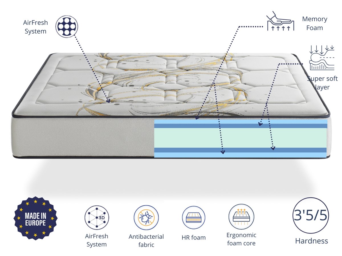 Colchón de alta gama con núcleo de espuma de poliuretano que se adapta milimétricamente al cuerpo, ofreciendo soporte firme, independencia de lecho y excelente ventilación. Cuenta con 7 zonas de confort y doble cara idéntica para un descanso duradero. Acolchado con viscoelástica y espuma Super Soft para una tumbada efecto nube. Tejido stretch transpirable y elástico, con acabados modernos y laterales suaves al tacto. Diseño elegante con doble cosido de seguridad que garantiza resistencia y durabilidad..