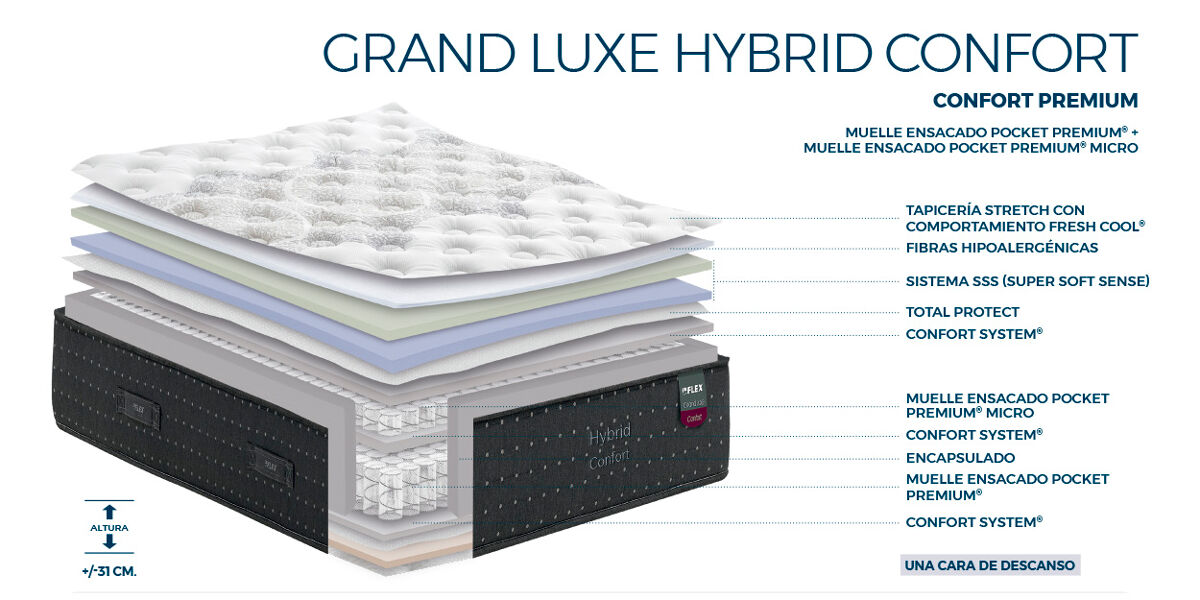 Sumérgete en el lujo y confort del Colchón GRAND LUXE CONFORT de Muelle Ensacado Pocket Premium®, Encapsulado, Confort System®, Muelle Ensacado Pocket Premium® Micro, Confort System®, Total Protect, Sistema SSS (Super Soft Sense), Fibras Hipoalergénicas, Tapicería Stretch con Comportamiento Fresh Cool®. One side. Altura: ± 31 cm. Descanso de alta gama para renovar tus noches. ¡Descubre la excelencia en cada sueño!