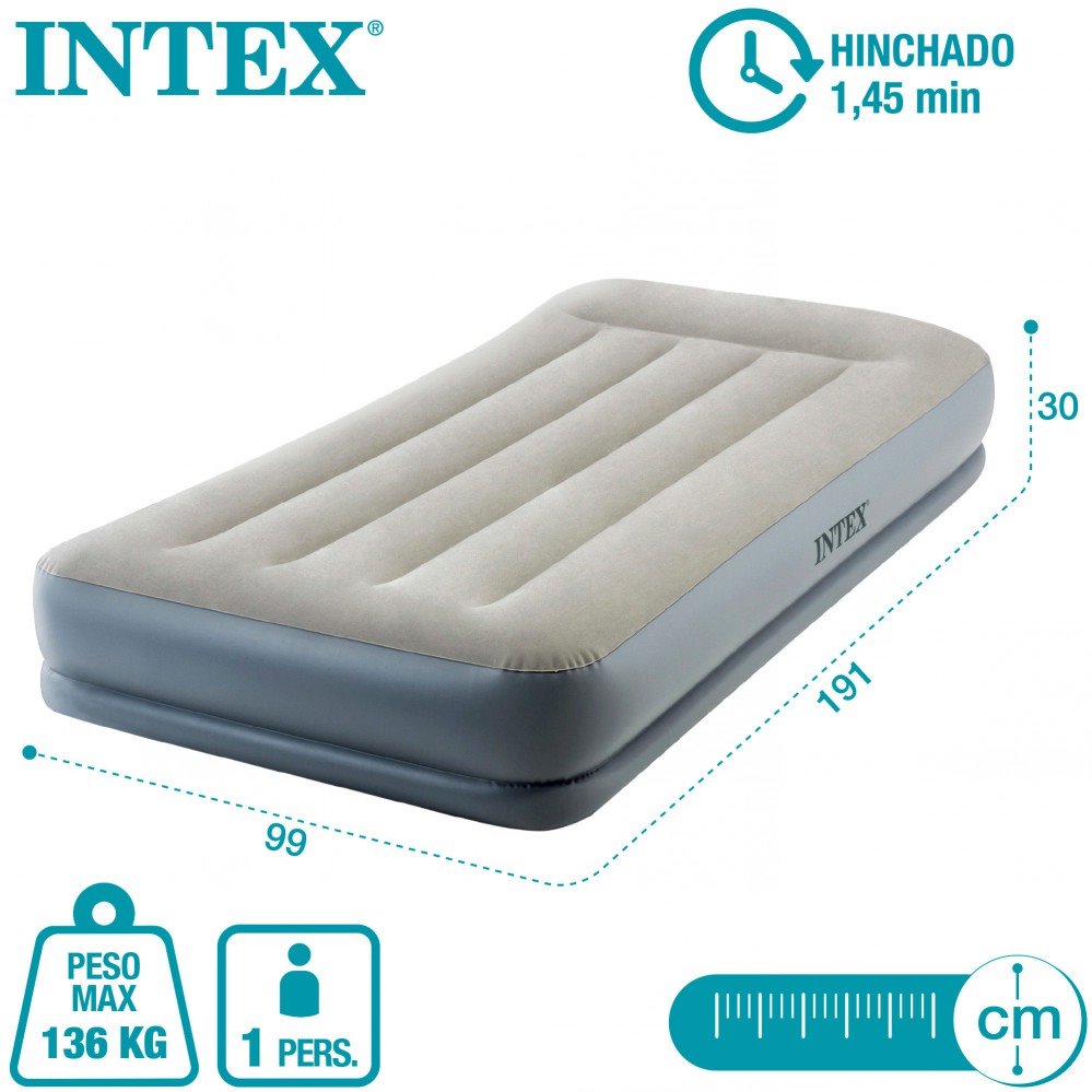 El colchón hinchable Pillow Rest Mid-Rise de la gama Dura-Beam Standard INTEX es perfecto para descansar en cualquier espacio gracias a su ligereza y confort. Pensadp para llevar de camping, de vacaciones o para invitados en casa. Diseñado para 1 persona (peso máximo 136 kg) con medidas 99 cm de ancho x 191 cm de largo con una altura de 30 cm, cuenta con una base de vinilo y una superficie flocada y suave al tacto. Además, la zona de la almohada está ligeramente elevada para un mayor confort. Fabricado con PVC de primera calidad, con mayor resistencia al agua y construido con la exclusiva tecnología Fiber-Tech, compuesta de miles de fibras de poliéster permiten que el colchón se adapte a tu cuerpo y mantenga la firmeza en cada uso. El colchón incorpora una bomba de aire eléctrica para su inflado y desinflado con una potencia de 220/240 V para que lo tengas listo en 1,45 min, aunque se puede hinchar con una bomba manual. Además se pliega rápidamente para guardar o transportar con facilidad.