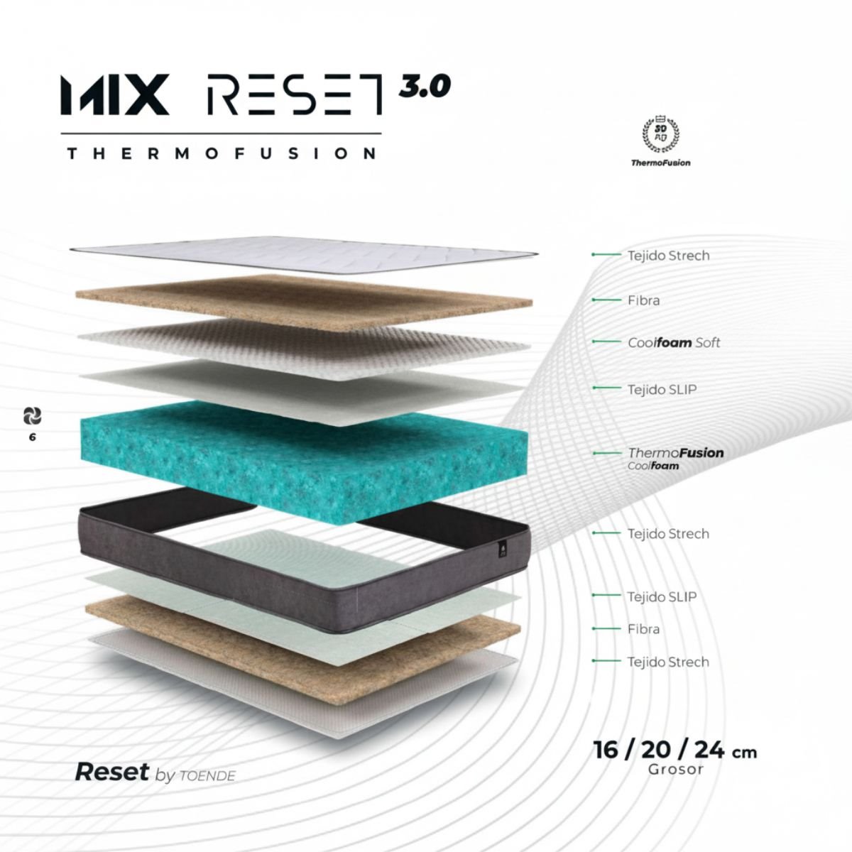 Descubre el confort accesible con el colchón Reset Obi 20 de la colección Mix de Reset by Toende, la alternativa económica que combina calidad, adaptabilidad y un precio inmejorable. Diseñado para apartamentos, habitaciones de invitados o cualquier espacio donde busques una solución práctica, este modelo ofrece un descanso reparador sin comprometer la comodidad. Su núcleo de CoolFoam ThermoFusion proporciona una base firme y duradera, asegurando un soporte óptimo para todo tipo de durmientes. La tecnología ThermoFusion favorece la ventilación y regulación de la temperatura, manteniendo la frescura y evitando la acumulación de humedad durante toda la noche.
