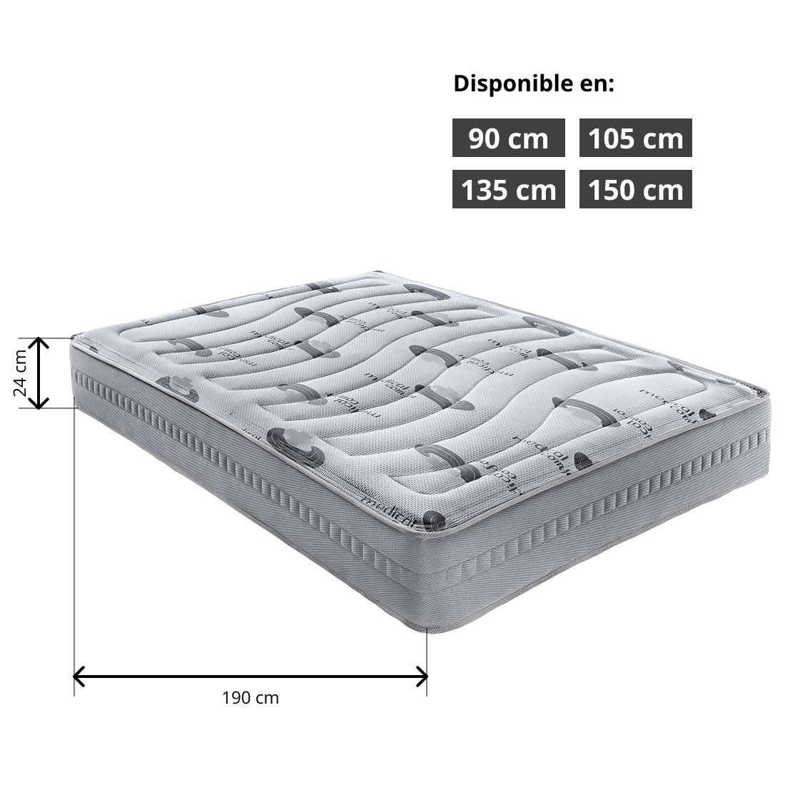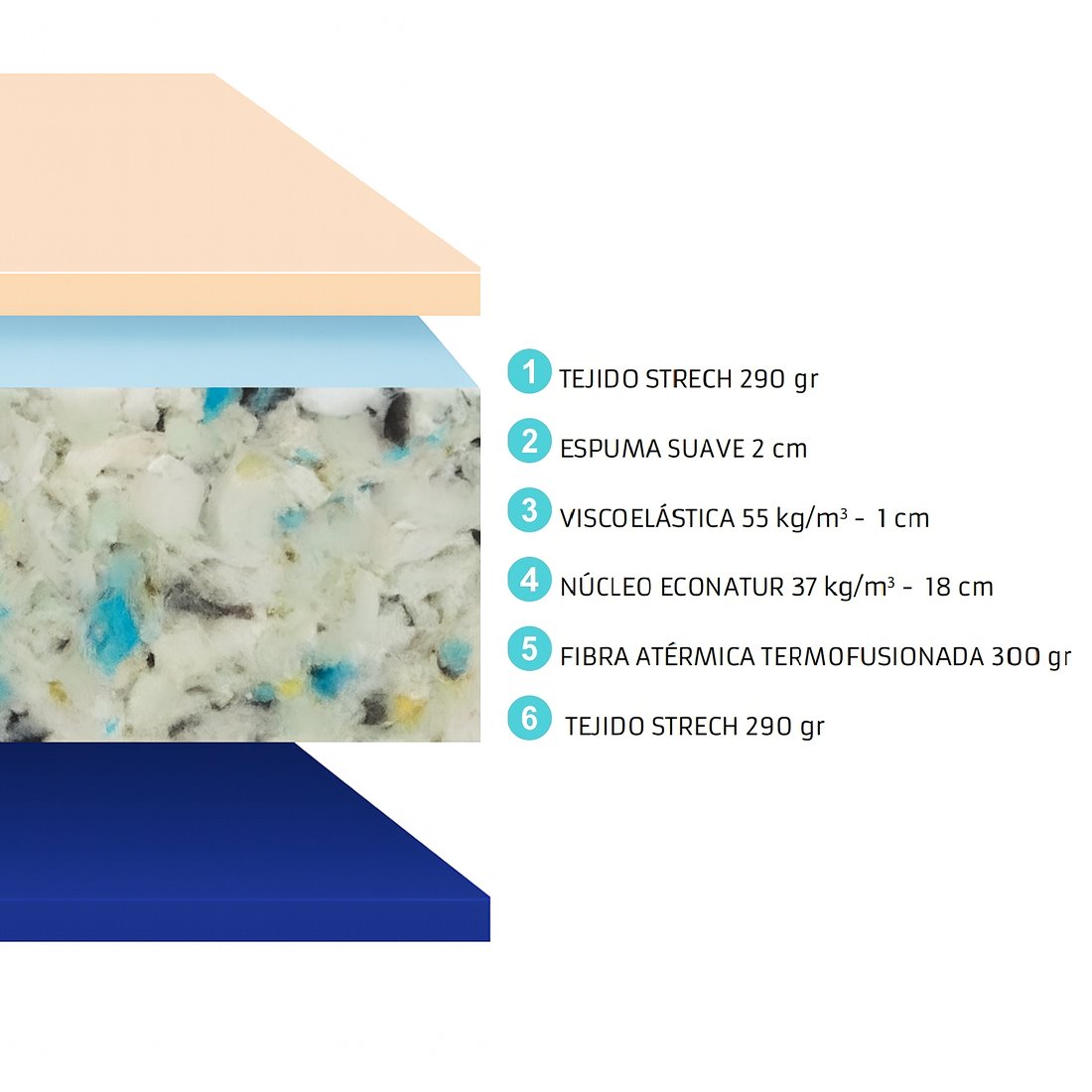 DISEÑO: Colchón de alta calidad con estructura multicapa que combina materiales técnicos para ofrecer confort y durabilidad. Su diseño de doble cara permite disfrutar del mismo nivel de comodidad durante todo el año. CONFORT: Incluye 1 cm de viscoelástica de 55 kg/m³ y 2 cm de espuma súper suave, proporcionando una acogida gradual y un descanso envolvente. El núcleo ECONATUR de 18 cm con densidad de 37 kg/m³ asegura un soporte estable y ergonómico. TRANSPIRABILIDAD: El tejido strech de 290 g/m² y la cara inferior con fibra atérmica termofusionada favorecen la circulación del aire y mantienen una temperatura equilibrada durante el sueño. Ideal para climas cálidos o habitaciones con poca ventilación. ADAPTABILIDAD: Gracias a su estructura flexible y materiales de alta elasticidad, se adapta a la forma del cuerpo y a los movimientos naturales del descanso, reduciendo los puntos de presión y mejorando la postura. DURABILIDAD: El acolchado tridimensional y el soporte TST con confección tapa a tapa garantizan resistencia y estabilidad. Con una altura total aproximada de 24 cm, combina confort, firmeza y larga vida útil. Envio: La entrega se realiza en la puerta principal del edificio o a pie de calle. No incluye instalación.
