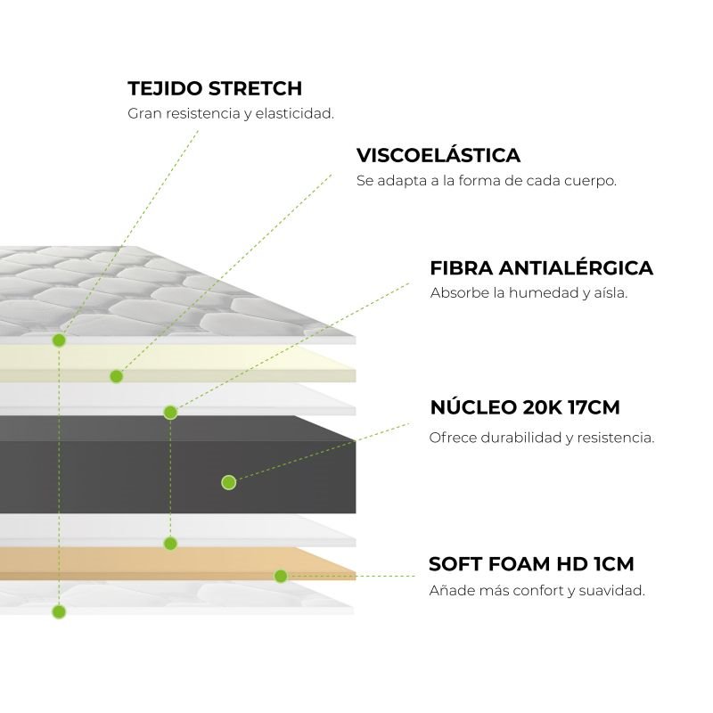 - Núcleo 20K 17cm: El núcleo del colchón está compuesto por una capa de 17 centímetros de espesor de material de alta densidad (20K), ofreciendo una base firme y duradera para un descanso estable y confortable.