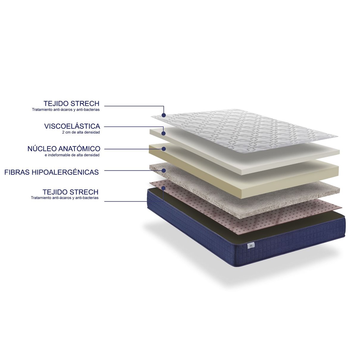 Colchón de gama básica con núcleo anatómico y acolchado 100% viscoelástico suave que permite gran adaptabilidad y comodidad. Presenta alta transpirabilidad, firmeza intermedia y tratamiento antialérgico y anti bacterias. Cuenta también con función doble cara Verano/Invierno. Está certificado por AITEX, lo que asegura el cumplimiento de estrictos estándares de calidad y seguridad. Fabricado en España, este colchón de gama básica es perfecto para habitaciones juveniles, segundas residencias o quienes valoran una buena relación calidad-precio. Y está disponible en diferentes medidas de ancho (90cm, 105cm, 135cm y 150cm), en dos largos estándar (190cm y 200cm), y también en dos alturas diferentes (14cm o 20cm). Es ideal para un descanso confortable y saludable para quienes buscan un colchón cómodo a buen precio.