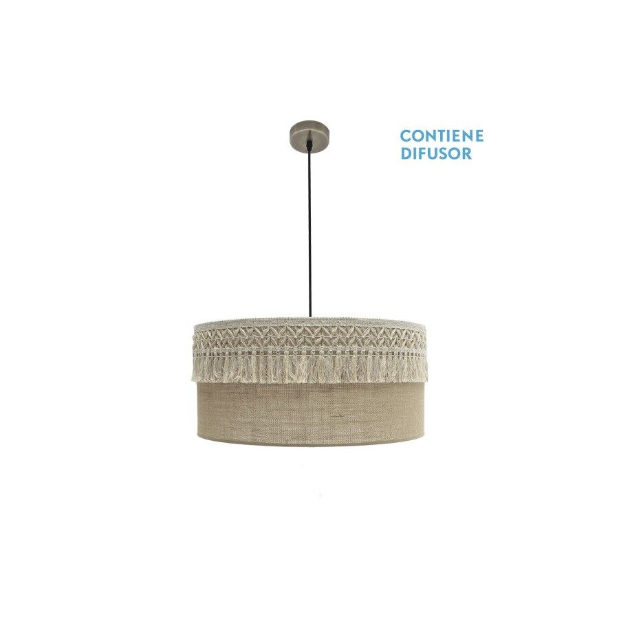 Colgante de la serie EKATERINA de color CUERO con pantalla confeccionada en tela de SACO. Posee tres portalámparas E27. Bombillas no incluidas. Se caracteriza por su original pantalla, confeccionada con una pasamanería de hilos en beis, aportando un diseño exclusivo y muy elegante para dormitorios, entraditas, salones y salas de estar, combinando con múltiples estilos de decoración, desde el rústico al vintage, moderno o clásico.. Tiene unas dimensiones, regulables en altura, de 27<88x60x60 centímetros. En esta serie podemos encontrar una gran variedad de artículos como son los colgantes de 60, 50, 40 y 30 centímetros de diámetro, dos tamaños diferentes de sobremesas, aplique, plafones de 48,72 y 96 watios y el pie de salón, todos combinando el tejido de saco con cuero o blanco.