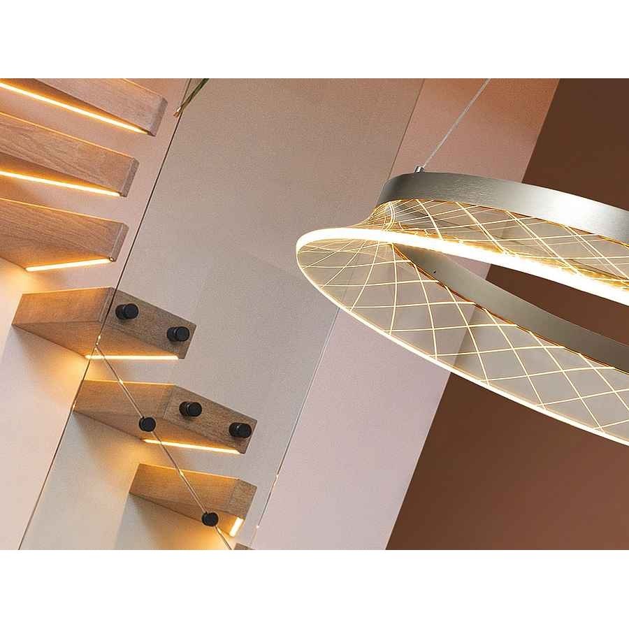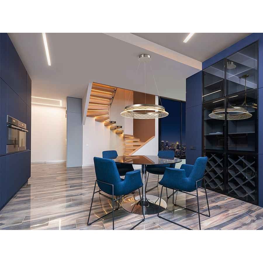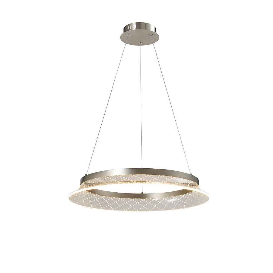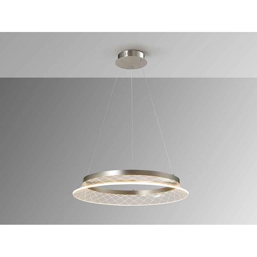 Lámpara realizada en metal cromado, con aro de acrílico transparente tallado. Regulable en altura. Iluminación LED 26,5W, 2200lm, 3.000K.