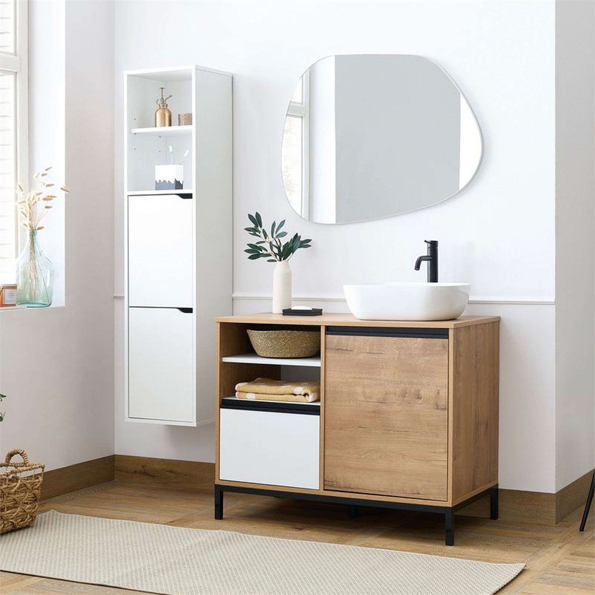 Armario auxiliar de baño Nadia en color roble gold o blanco, con un diseño moderno, un estilo que es tendencia actualmente. Gracias a esta columna de baño disfrutarás de un buen espacio de almacenaje en tu baño o aseo, permitiéndote guardar objetos como toallas, colonias u otros objetos de higiene que uses a diario. ¡Completa tu baño con la columna de baño Nadia! Columna de baño Nadia fabricada en melamina de alta calidad. En la estructura de este mueble encontrarás varios compartimentos: dos huecos superiores, divididos por un estante regulable, y dos armarios inferiores (uno de ellos con un estante interior regulable).Además, ofrece dos opciones de montaje, colgada en la pared o de pie. No se incluyen los otros muebles u objetos decorativos de las imágenes. Incluye los herrajes para colgar la columna a la pared. Medidas: Columna Alto 150 cm Ancho 36'5 cm Profundo 30 cm. Ancho útil del mueble 33 cm. Profundidad útil del mueble 27'5 cm. Altura hueco superior sin la balda 50 cm. Altura hueco puerta superior (sin la balda) 45 cm. Altura hueco puerta inferior 49 cm. Se trata de mobiliario con kit de montaje, que incluye manual de instrucciones y tornillería.