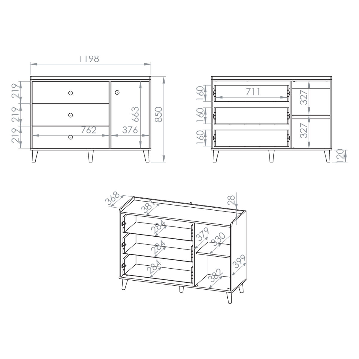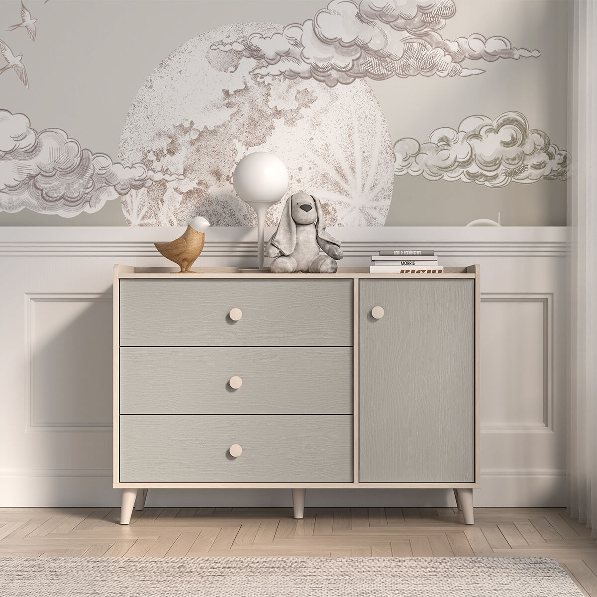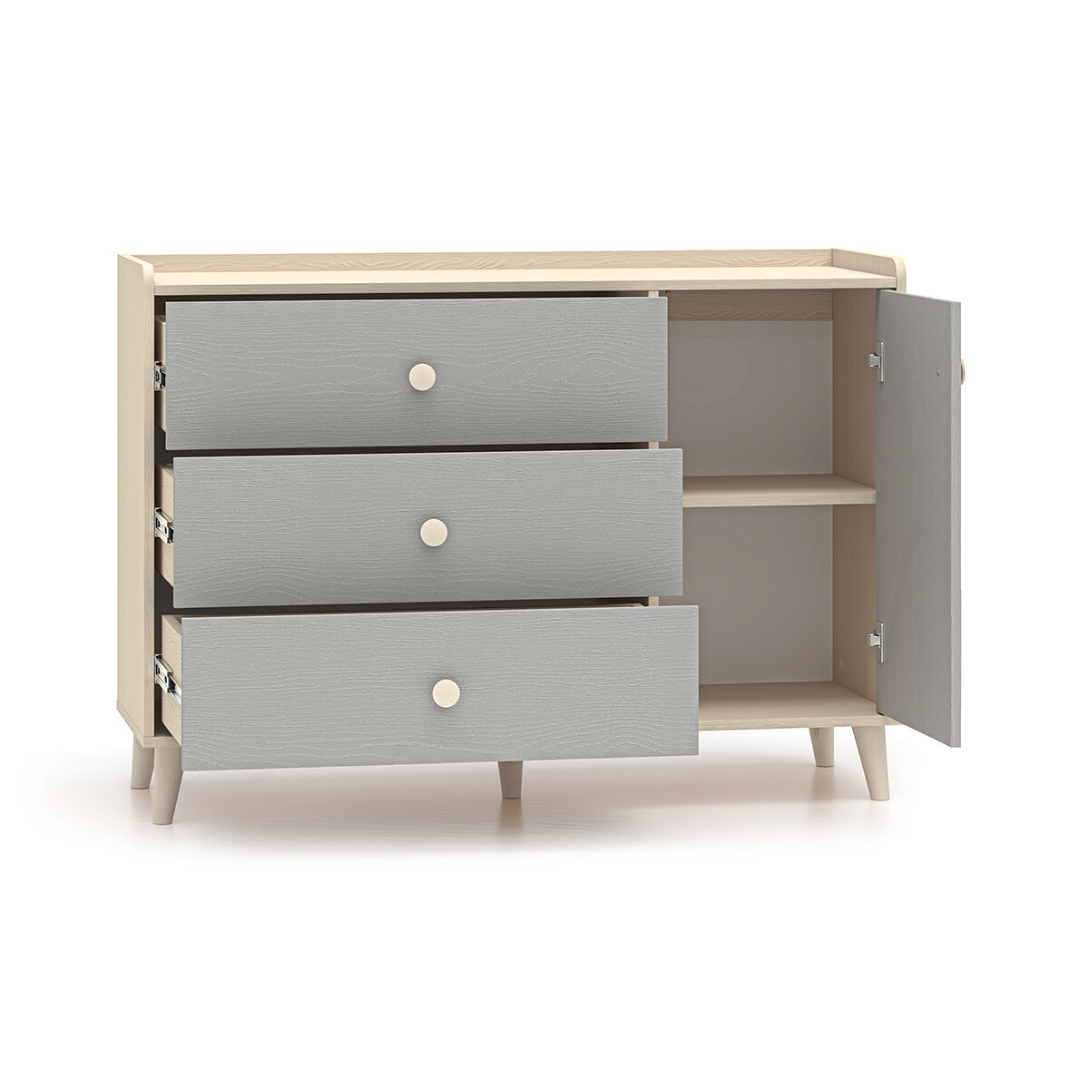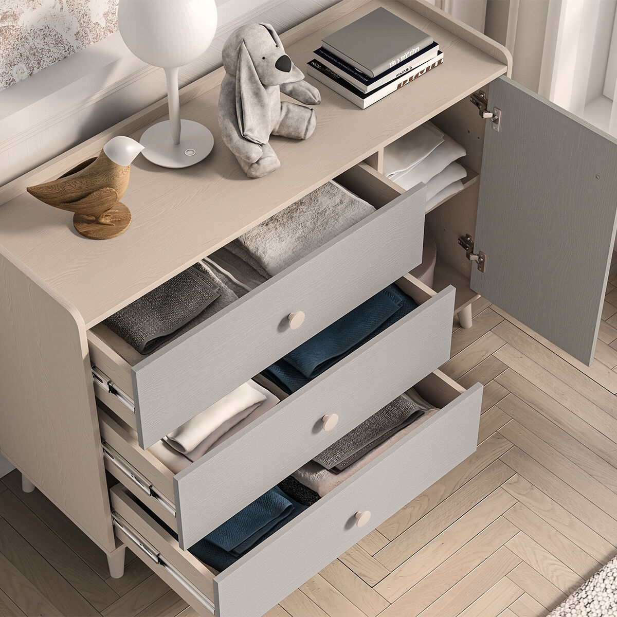 Carga máxima recomendada: 25 kg en la parte superior del mueble, 10 kg en el estante y 5 kg en los cajones