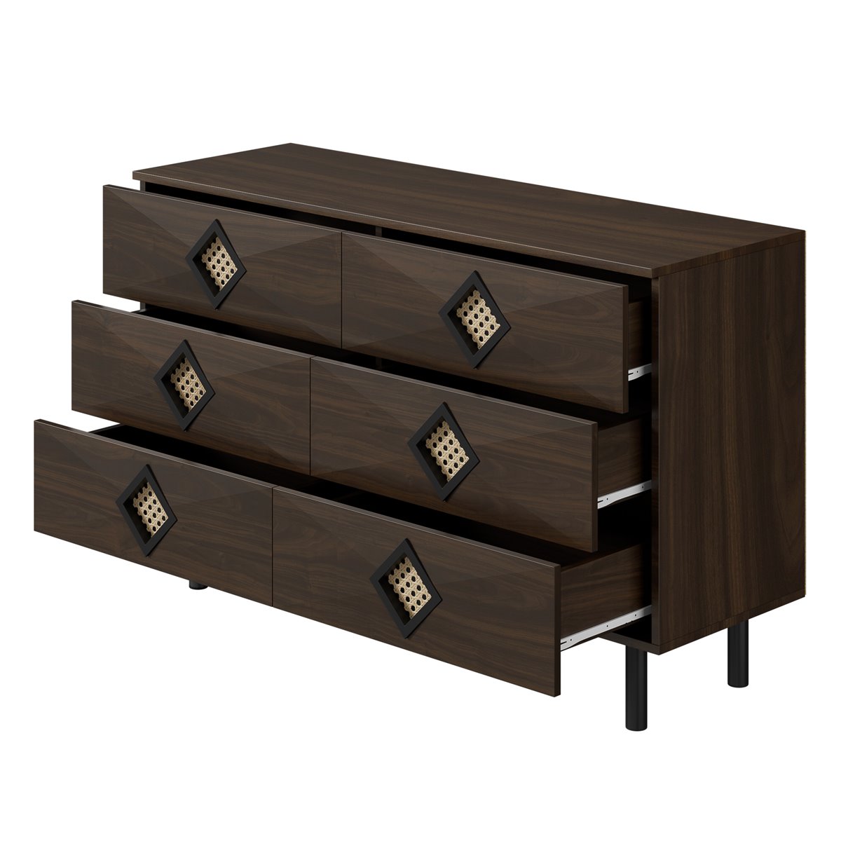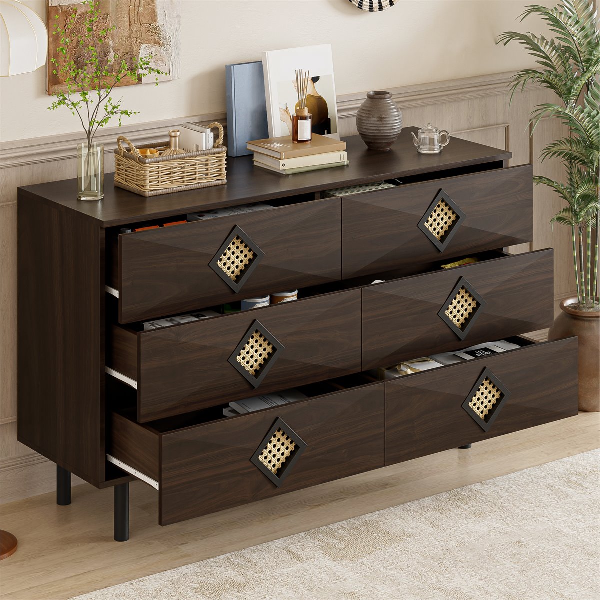 Elegantes tiradores de ratán: El toque final del tocador son sus tiradores decorativos de ratán en forma de diamante, que no solo son funcionales, sino que también aportan un toque moderno y rústico a su habitación. Estos detalles convierten la mesa en un punto focal único en su dormitorio o sala de estar.