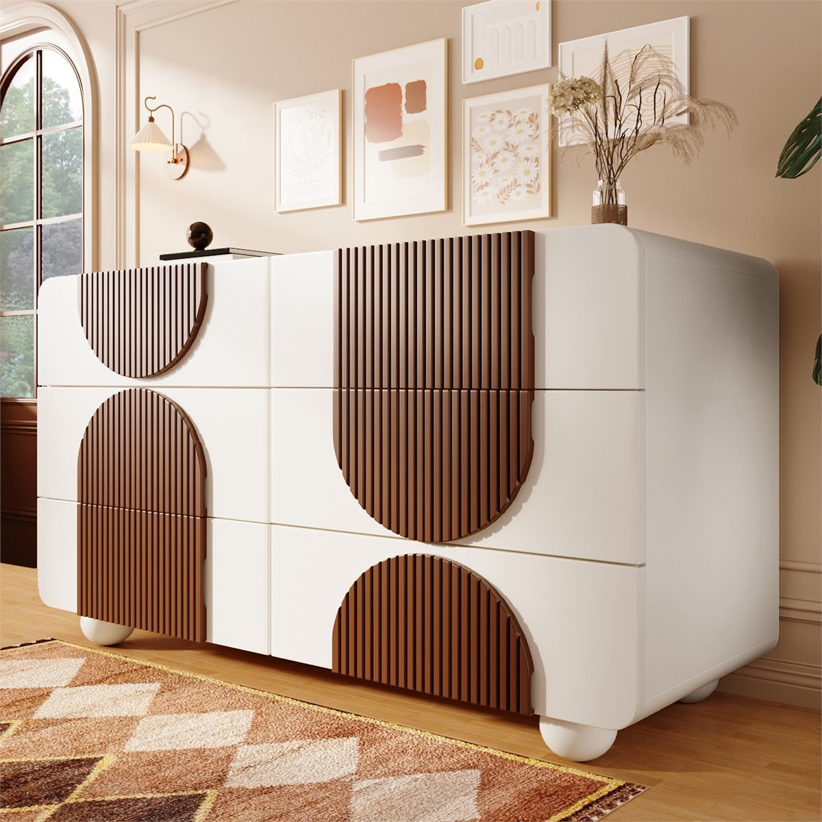 Diseño elegante y estilizado con líneas curvas: Esta cómoda de seis cajones está fabricada con paneles de madera blanca de alta calidad, adornada con molduras de madera rayada color chocolate y patas bajas, esféricas y blancas de madera maciza. Su diseño curvo crea una apariencia elegante y sofisticada, una combinación perfecta de decoración y almacenamiento, y realza el estilo de cualquier habitación.