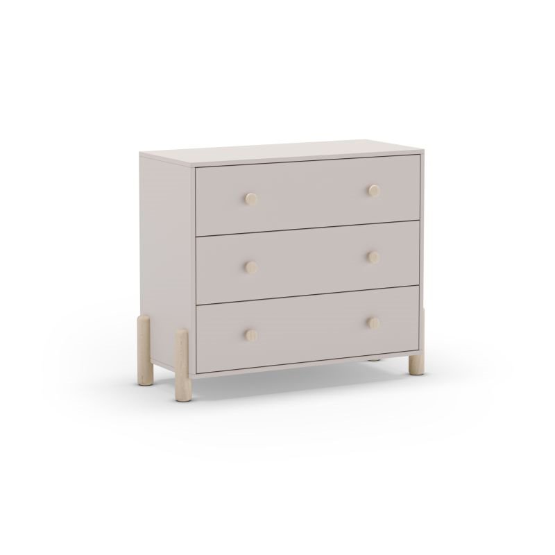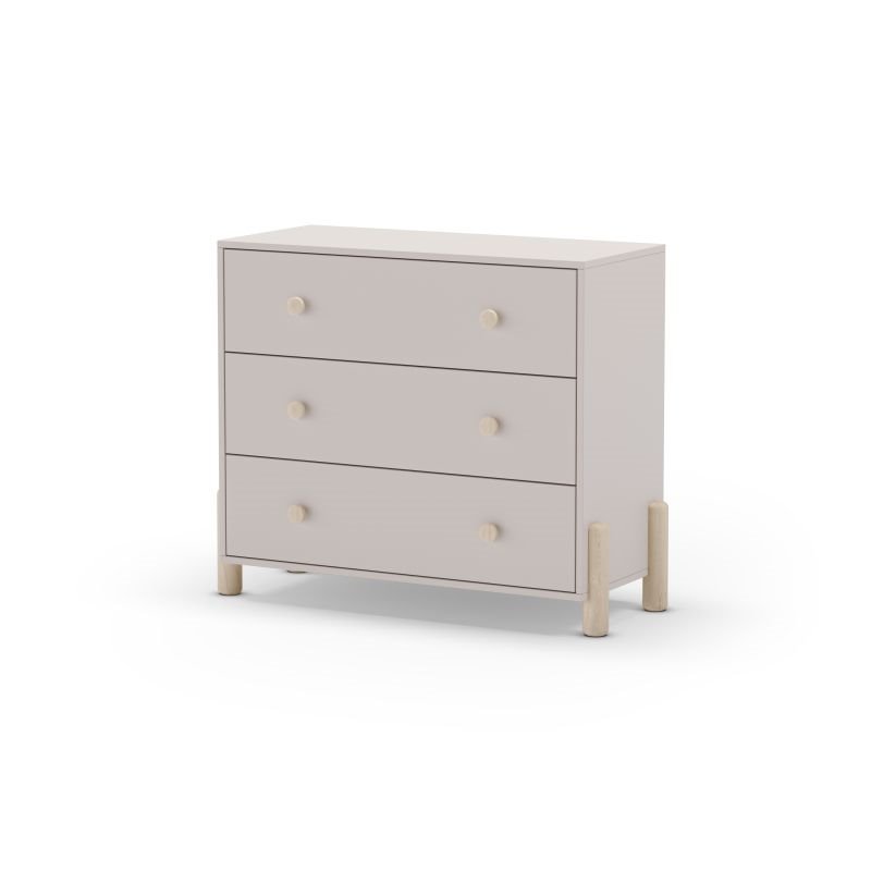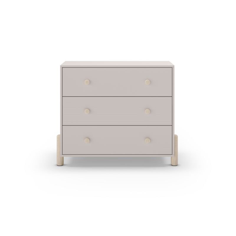 Los tiradores circulares y las patas de madera aportan un contraste sutil en acabado y textura, acentuando su diseño original sin renunciar a la simplicidad.