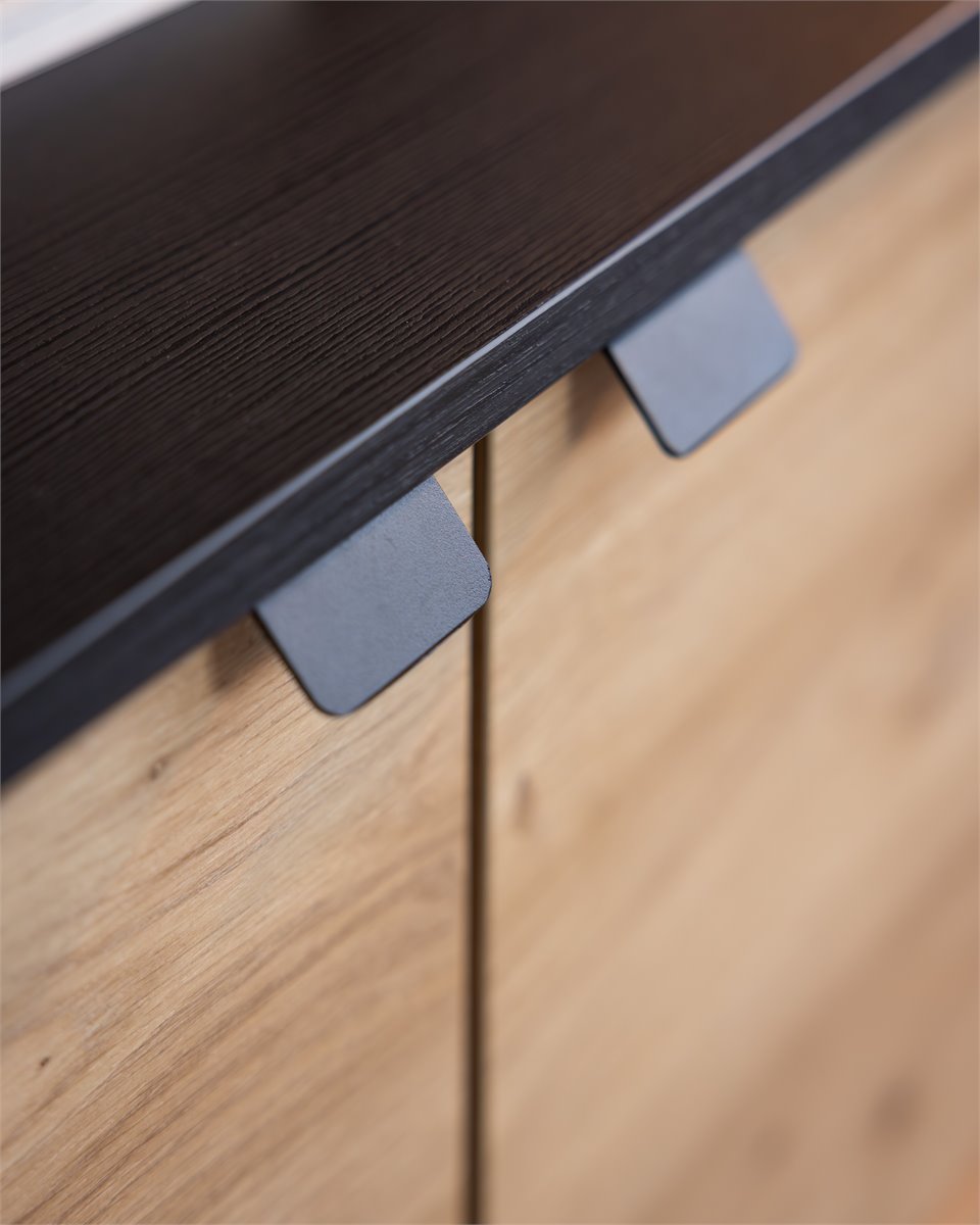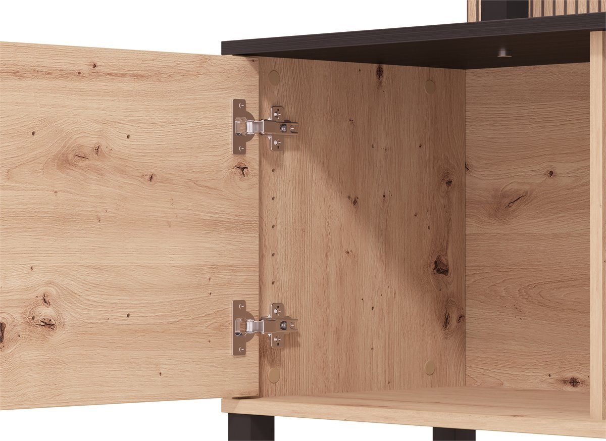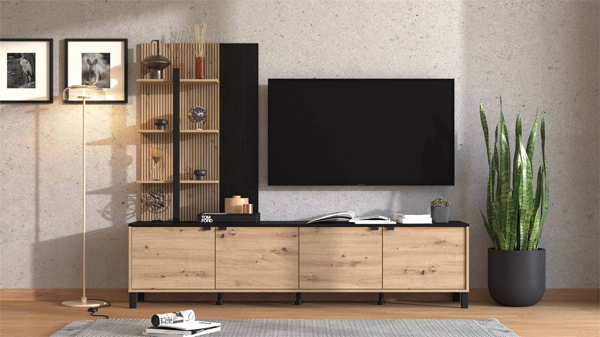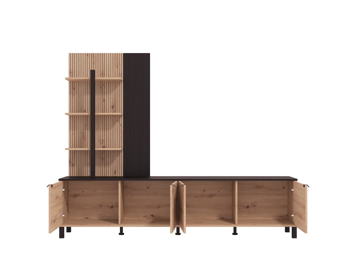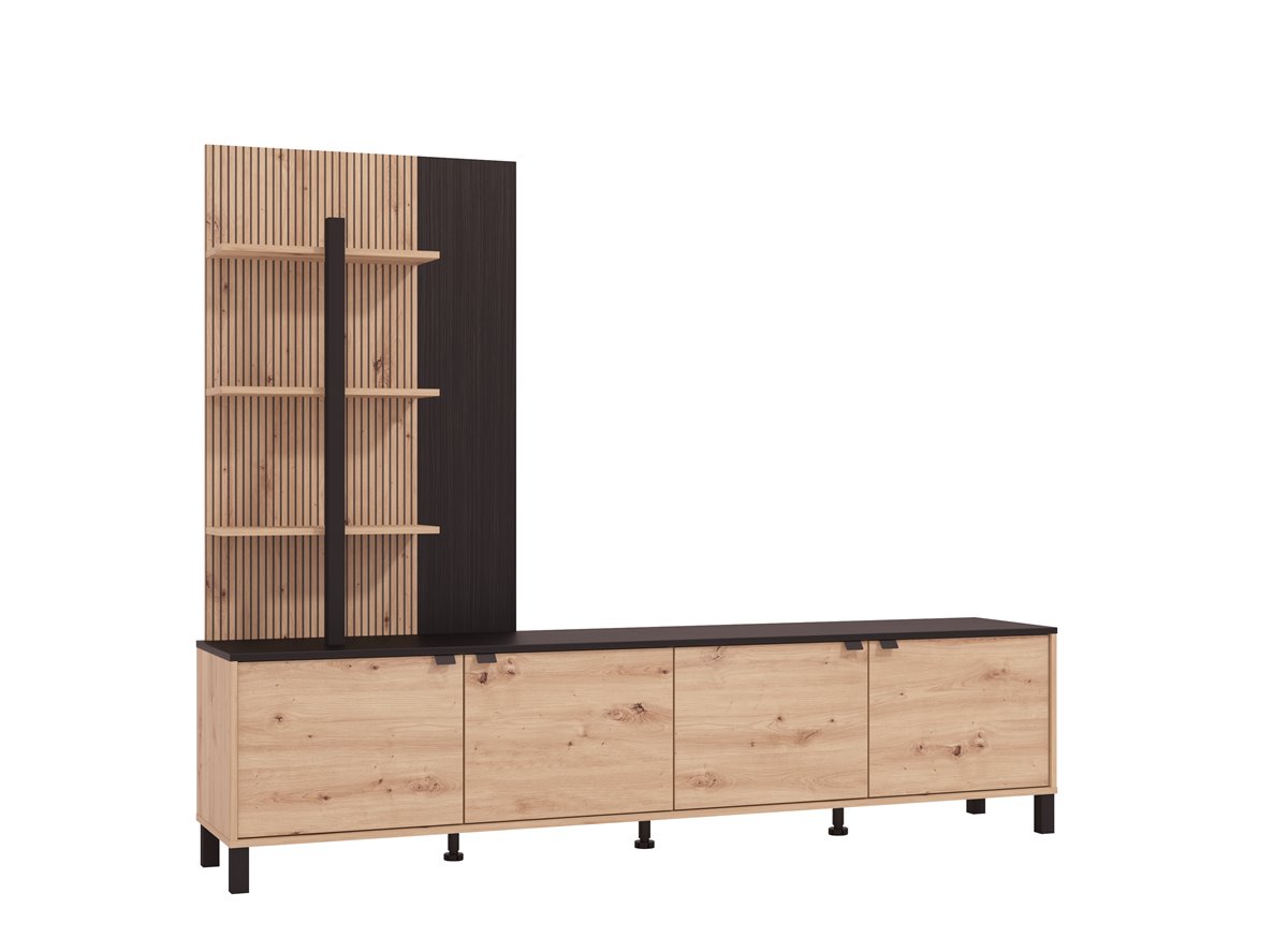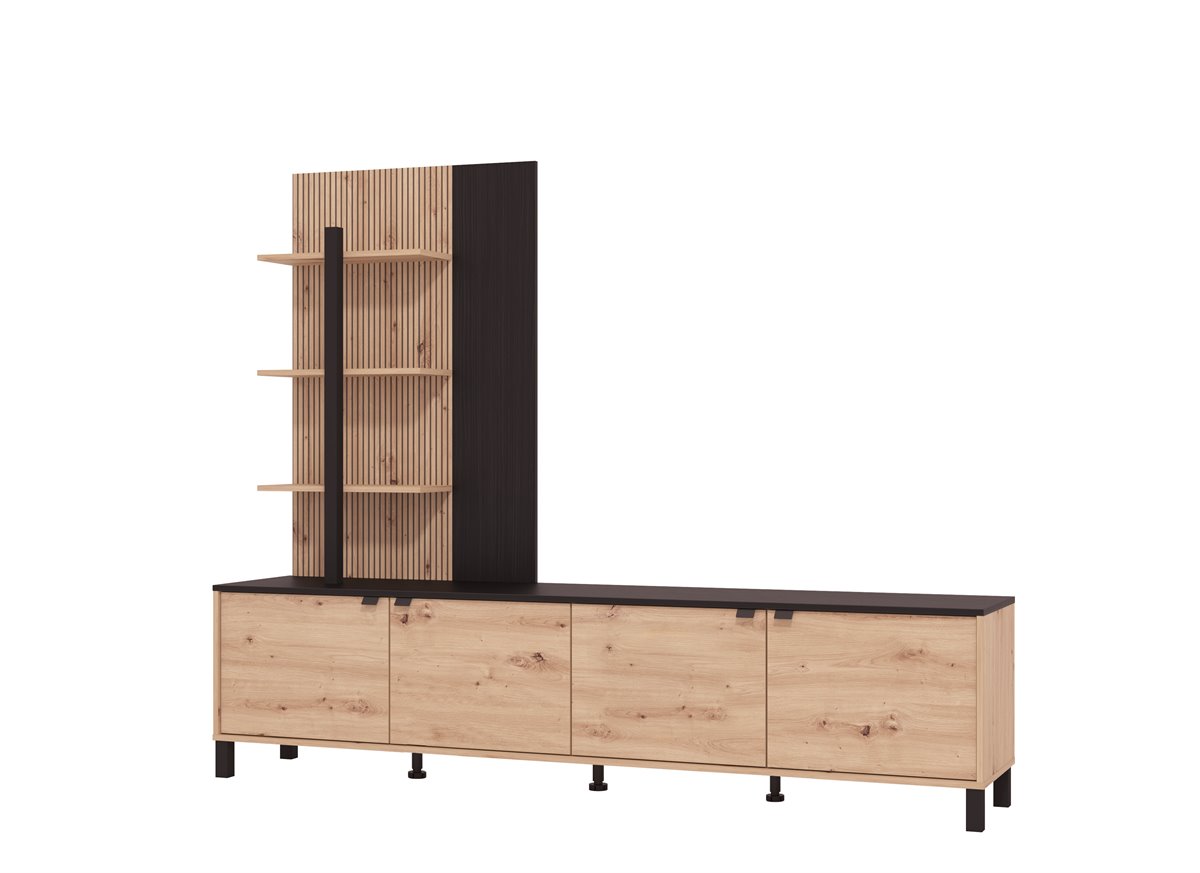 El Belgrado Compacto TV de 208 cm es una excelente opción para quienes buscan un mueble funcional y con un diseño moderno. Su estructura está fabricada en melamina de alta calidad en color negro, ofreciendo durabilidad y resistencia al uso diario. El frente del mueble destaca por sus franjas decorativas que combinan el negro con detalles en roble, creando un contraste visual atractivo y elegante.Con un ancho de 208 cm, una altura de 167 cm y una profundidad de 40 cm, este compacto de TV ofrece amplio espacio ideal para organizar dispositivos electrónicos, libros, adornos o accesorios del hogar.