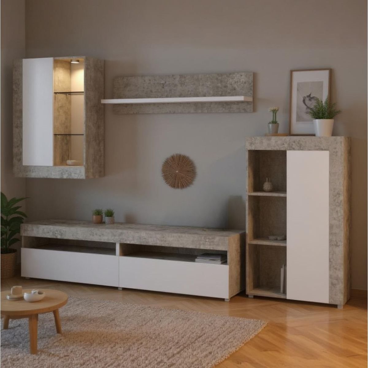 Descubre la composición de salón Tokio y transforma tu salón en el espacio que siempre has querido. Este conjunto está compuesto por cuatro piezas: un mueble de TV con puerta abatible, una vitrina, un estante de pared y un amplio aparador. El mueble de TV incorpora una puerta abatible que oculta dos compartimentos espaciosos, perfectos para guardar dispositivos electrónicos, vajilla u otros objetos que prefieras mantener fuera de la vista. Aporta un toque elegante y ordenado al ambiente. El aparador, de generosas dimensiones, cuenta con dos puertas que dan acceso a seis compartimentos interiores, ideales para seguir organizando todo lo que necesites.