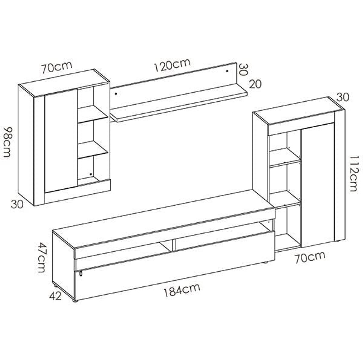 - Medidas mueble de TV: 47 x 184 x 42 cm (Alto x Ancho x Profundidad)