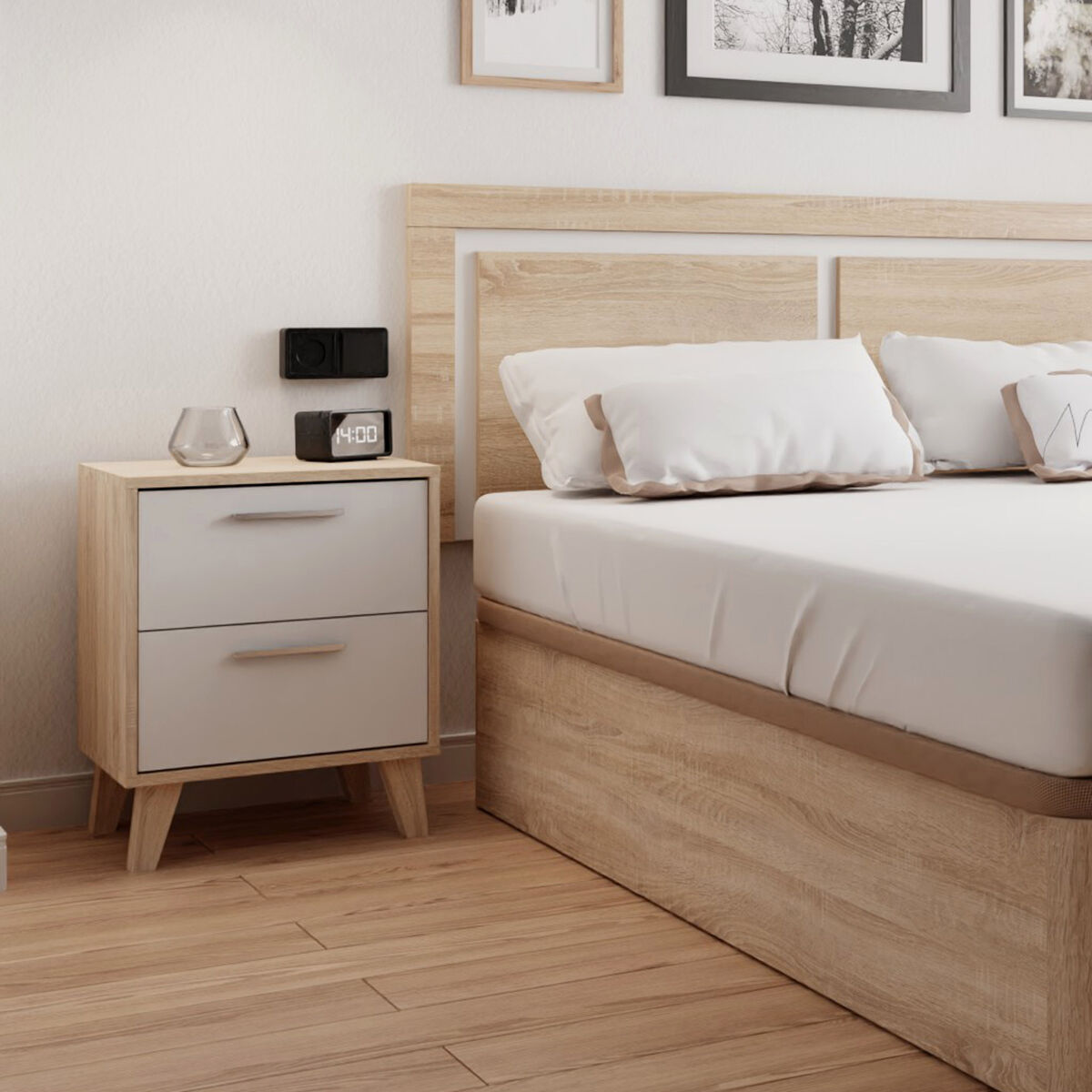 Dale un toque de elegancia y calidez a tu dormitorio con este cabecero de diseño moderno, acompañado por dos mesitas de noche a juego. El cabecero destaca por sus dos plafones centrales en acabado cambrian, enmarcados por un borde blanco que realza su estilo contemporáneo y aporta un atractivo contraste visual. Las mesitas de noche, con patas altas y dos cajones espaciosos, combinan funcionalidad y diseño para mantener tus objetos personales siempre organizados y al alcance. Este conjunto es ideal para crear un ambiente armonioso y sofisticado en cualquier dormitorio moderno.