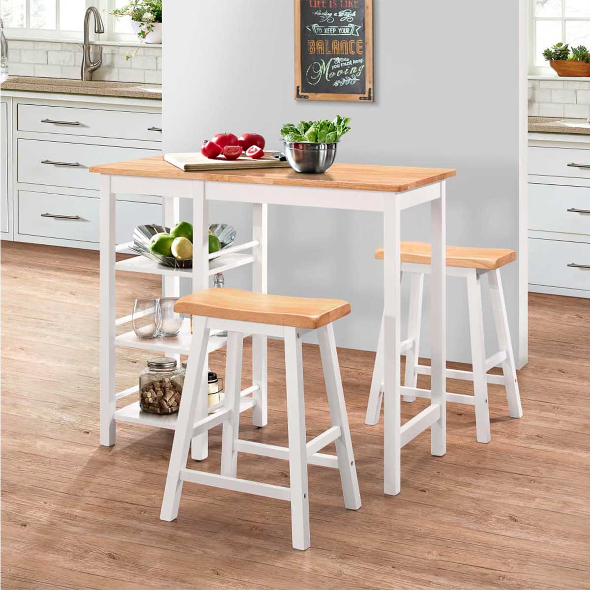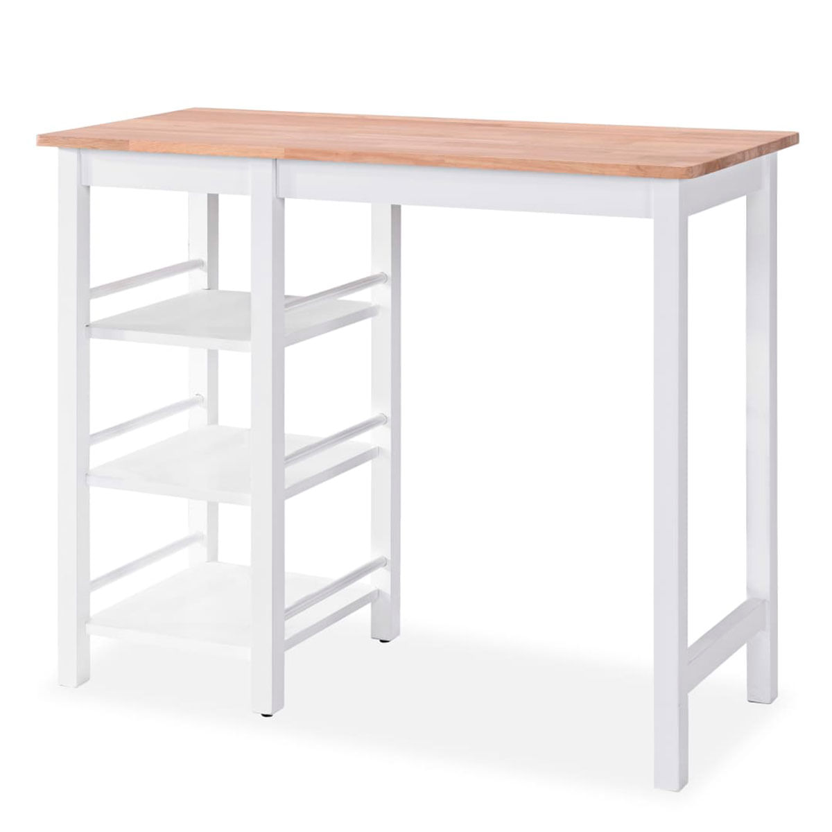 ¿Te gusta desayunar de pie junto a la repisa de la cocina? ¿O quizá te gustaría tener una pequeña isla? Este conjunto de comedor o cocina de mesa alta y 2 taburetes es ideal. La superficie de la mesa y los asientos están hechos de MDF lijado con acabado de aceite, mientras que las estructuras están fabricadas con madera de caucho, materiales muy resistentes y de alta durabilidad. Tiene un diseño clásico que combinará con cualquier tipo de decoración que tengas. Además, la mesa cuenta con 3 estantes en los que podrás dejar tus botellas, los cereales, o cualquier producto de despensa que quieras, incluso copas o algo de vajilla para tenerla a mano. Los taburetes altos te ofrecerán gran comodidad gracias a sus asientos altos. ¡Sin duda pasarás grandes momentos frente a esta mesa alta! ¡Consigue este estupendo conjunto de mesa y taburetes ya en Embargosalobestia!