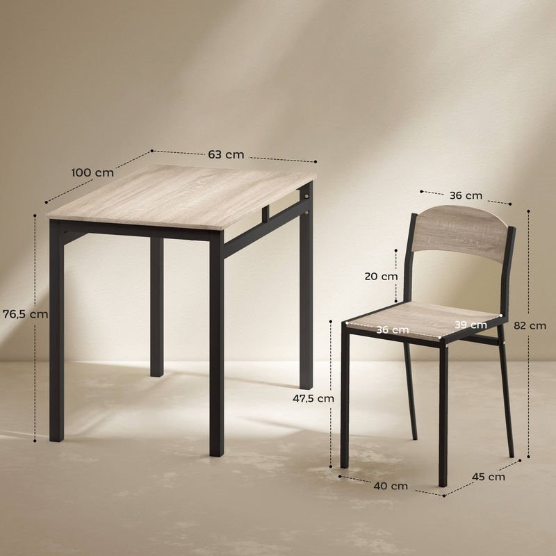 Aporta un estilo moderno a tu hogar con este conjunto de comedor HOMCOM compuesto por mesa y 4 sillas. Su acabado en roble claro con estructura metálica negra crea un contraste elegante y actual. Perfecto para cocinas pequeñas, apartamentos o comedores reducidos. Las sillas pueden guardarse bajo la mesa para ahorrar espacio. Fabricado en MDF laminado y metal, combina resistencia, funcionalidad y diseño en una sola pieza.