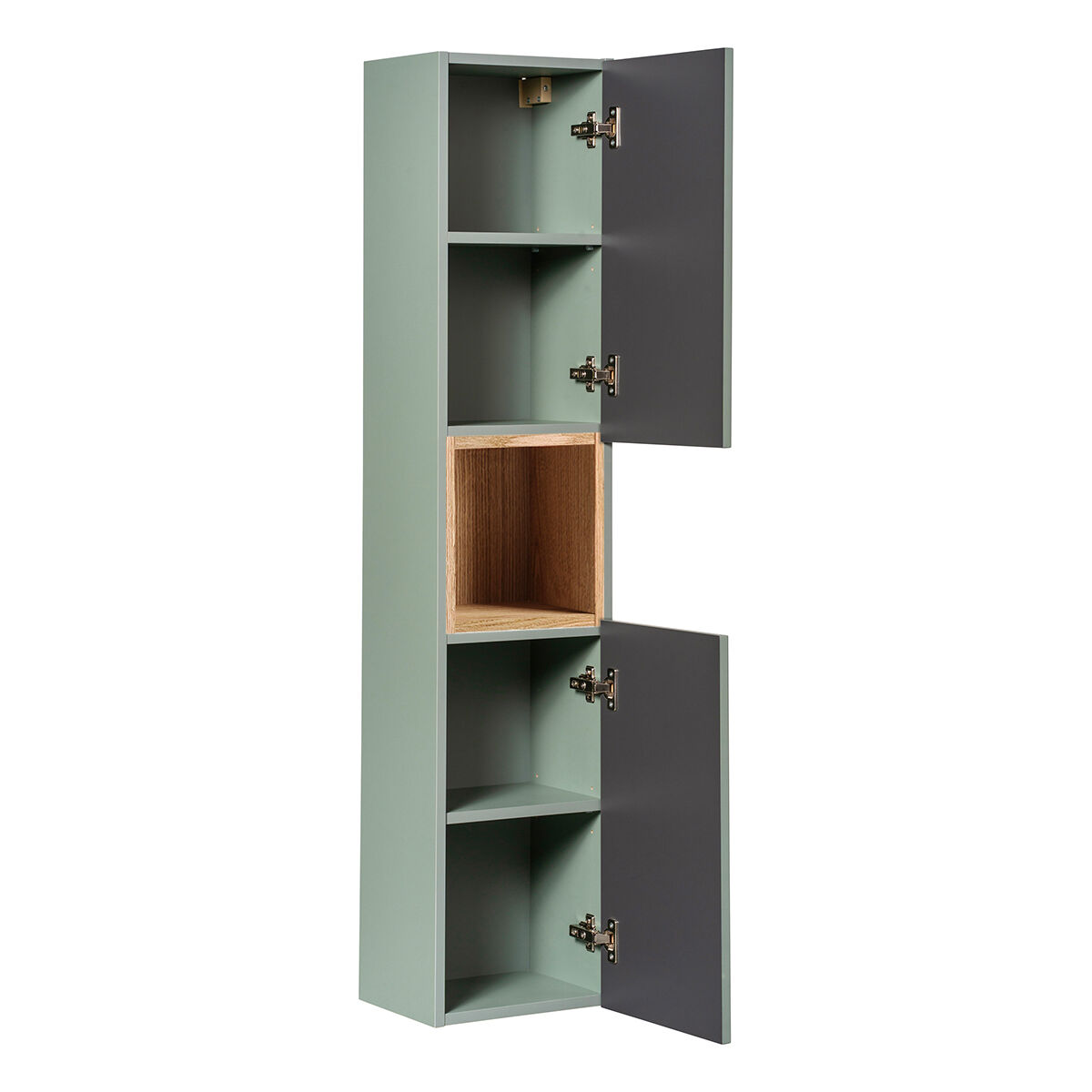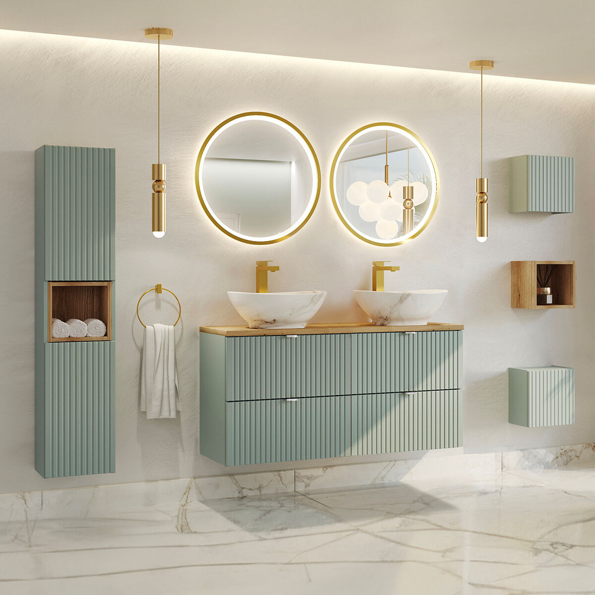 Conjunto de muebles con doble lavabo 120cm 4 cajones columna y 3 armarios de pared Jade Verde y Madera
