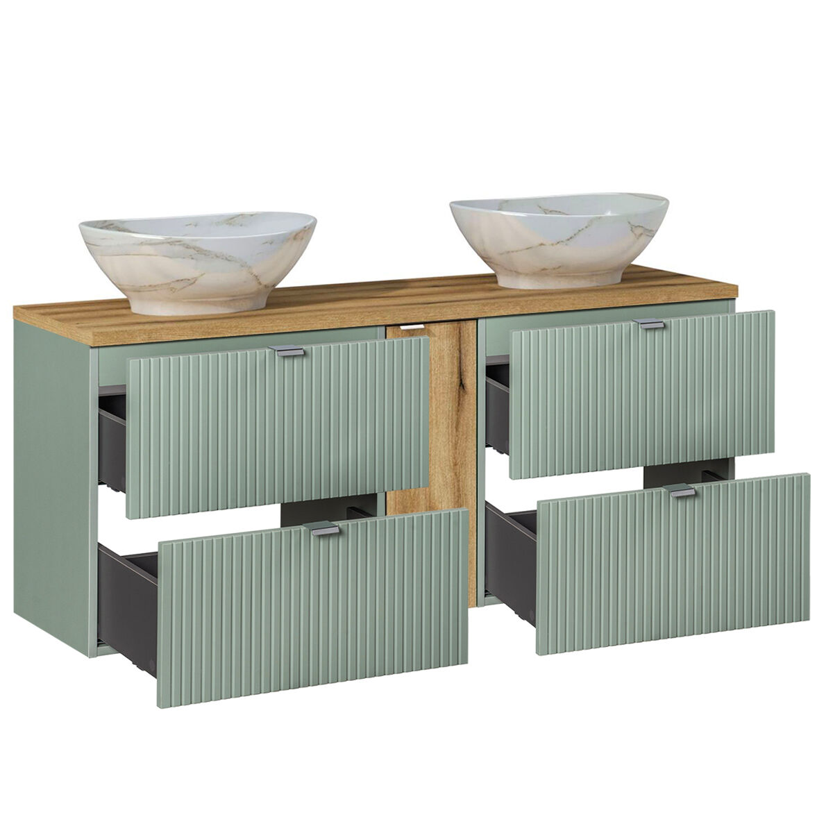 Conjunto de muebles con doble lavabo 140cm 4 cajones columna y 3 armarios de pared Jade Verde y Madera