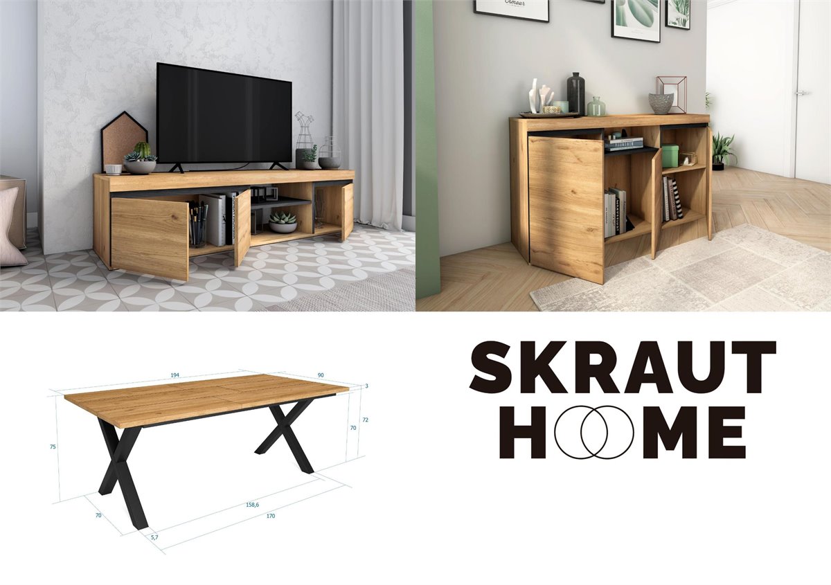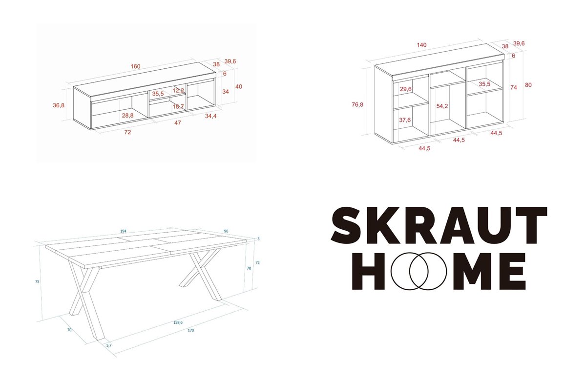 Composición y Materiales: El conjunto de muebles de salón moderno SKRAUT HOME está compuesto por 3 muebles. 1 aparador, 1 mueble de televisión, 1 mesa de comedor. Ideales para completar su salón. Fabricados con tableros de melamina de alta calidad, que les garantiza robustez y estabilidad.Color y estilo decorativo: El estilo industrial con las diferentes posibilidades de colores de los muebles SKRAUT HOME, los hace perfectos para crear un ambiente acogedor en su casa. Utilice estos muebles para añadir más almacenamiento en su sala de estar o recibidor. Mesa: La mesa de comedor Skraut Home es ideal para reuniones. Su estructura y patas de madera maciza garantizan una mesa robusta y estable. Su diseño aporta un toque rústico y natural a su hogar. Medidas: Mesa (140): 140x90x75cm - 6 comensales, Mesa (170) 167x90x75 - 8 comensales, Mesa (200): 194x90x75cm - 10 comensalesAparador: Increíble mueble que añadirá almacenaje y diseño a su salón o comedor. Con este mueble obtendrá más almacenaje, y superficie de decoración para sus libros u otros objetos con los que conseguirá darle su toque personal. Medidas:140,1x39,6x80,5cmMueble TV: Funcional mesa de tv de estilo nórdico que dará a su salón o comedor un toque innovador y moderno gracias a la armónica combinación de sus tonalidades. Medidas: Mueble TV (120) 120x39,6x40,5cm - Mueble TV (140) 140x39,6x40,5cm - Mueble TV (160) 160x39,6x40,5cmFácil de Montar: El conjunto de muebles SKRAUT HOME es fácil de montar y cuenta con instrucciones claras y detalladas. No necesitas herramientas especiales y podrá tenerlos acabados en poco tiempo.Ideas de uso: El conjunto de muebles SKRAUT HOME también es perfecto e ideal para situarlos en el comedor, en la cocina, como armario de pasillo para los pequeños objetos, en la entrada o como archivador de oficina de casa.Garantía: Los muebles SKRAUT HOME vienen con una garantía de 2 años y con un excelente servicio post venta. Nuestras mesas son enviadas con el sistema Easy Packaging, podrá transportarla fácilmente. Todos los paquetes que la componen pesan menos de 30 kg y miden menos de 120 cm.