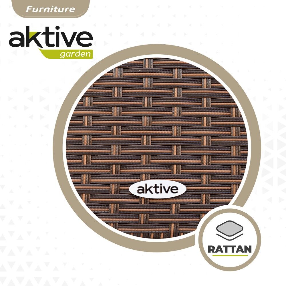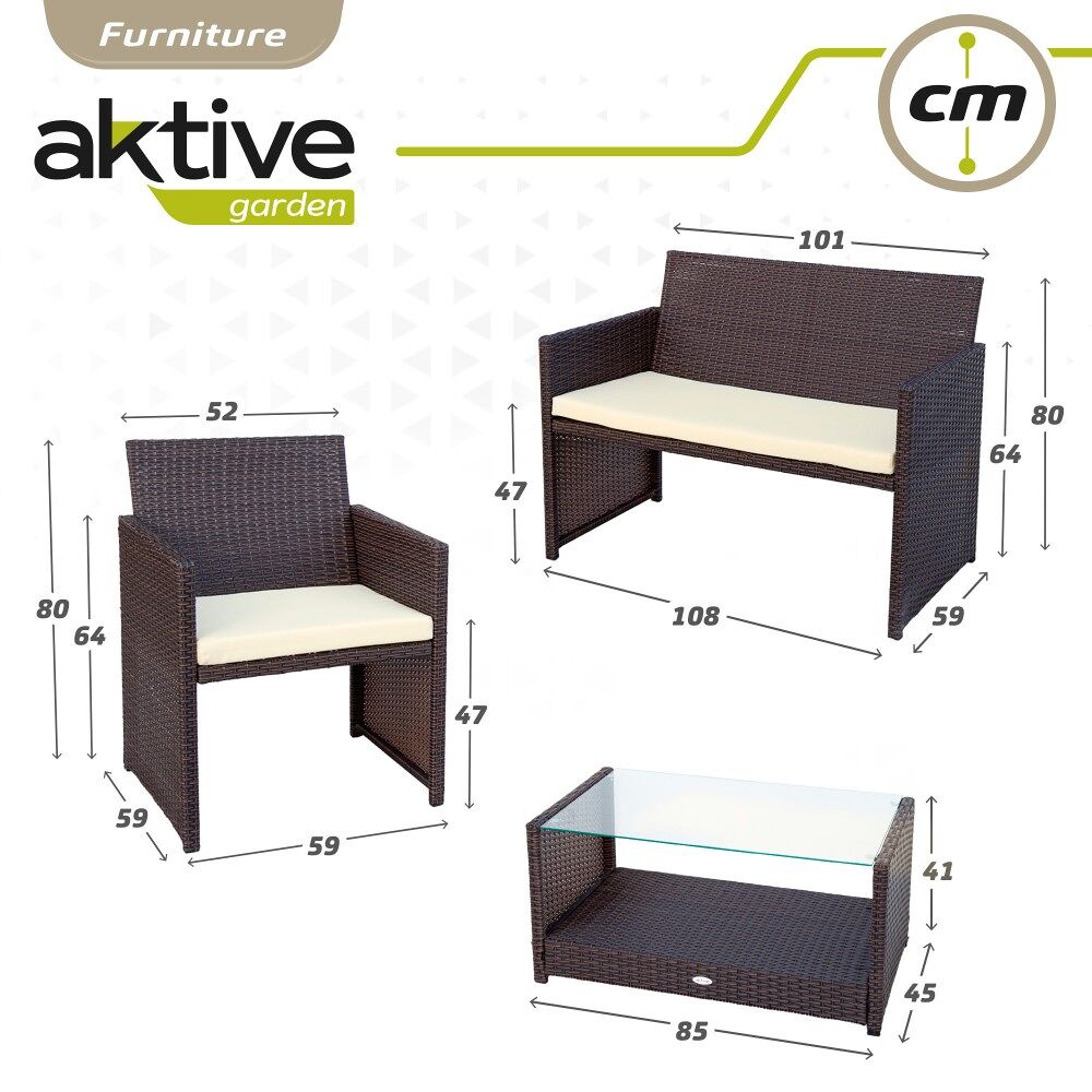 Conjunto de muebles de jardín Aktive Garden compuesto de dos sillones, un sofá y una mesa central. Tanto los sillones como la mesa están fabricados de ratán sintético, un material fácil de limpiar y resistente al agua y a la intemperie. Para un mayor confort y facilidad de uso, tanto los sillones como el sofá incluyen cojín acolchado color crema (poliéster 180 gramos) y la mesita cuenta con superficie de cristal para facilitar su limpieza y con balda inferior. Cada sillón mide 59 cm de ancho, 59 cm de largo y 76 cm de alto; el sofá mide 108 cm de ancho, 59 cm de largo y 76 cm de alto; la mesa mide 81 cm de ancho 45 cm de largo y 41 cm de alto. Conjunto ideal para usar en interior y en exterior.