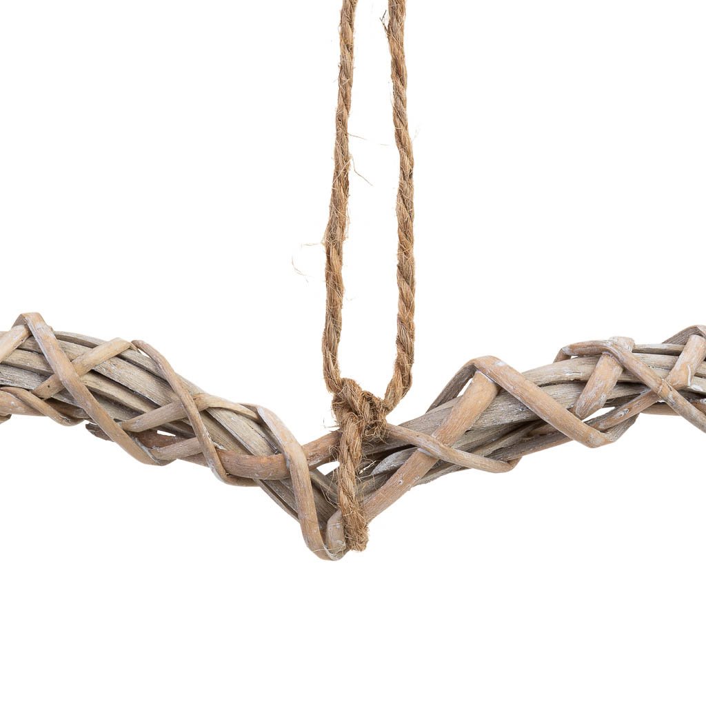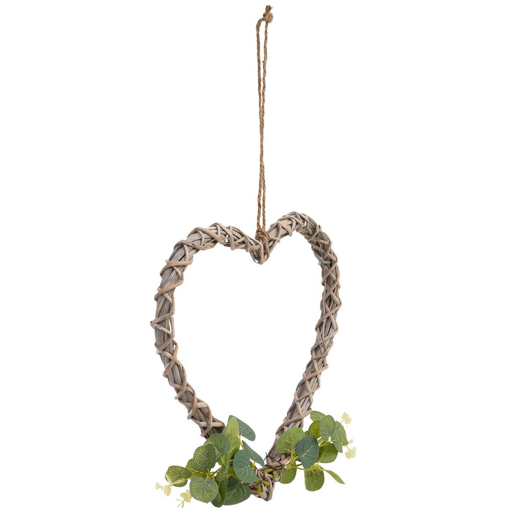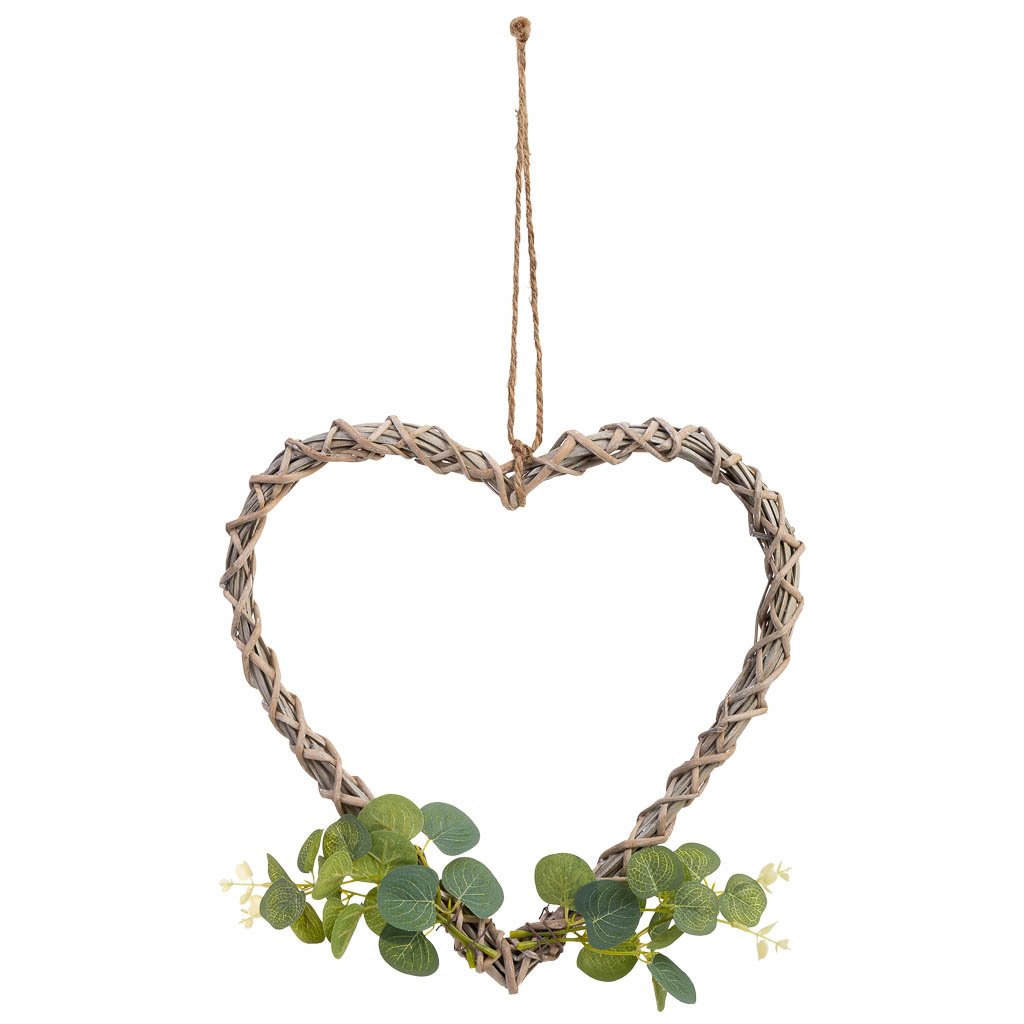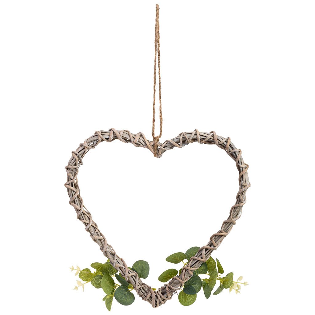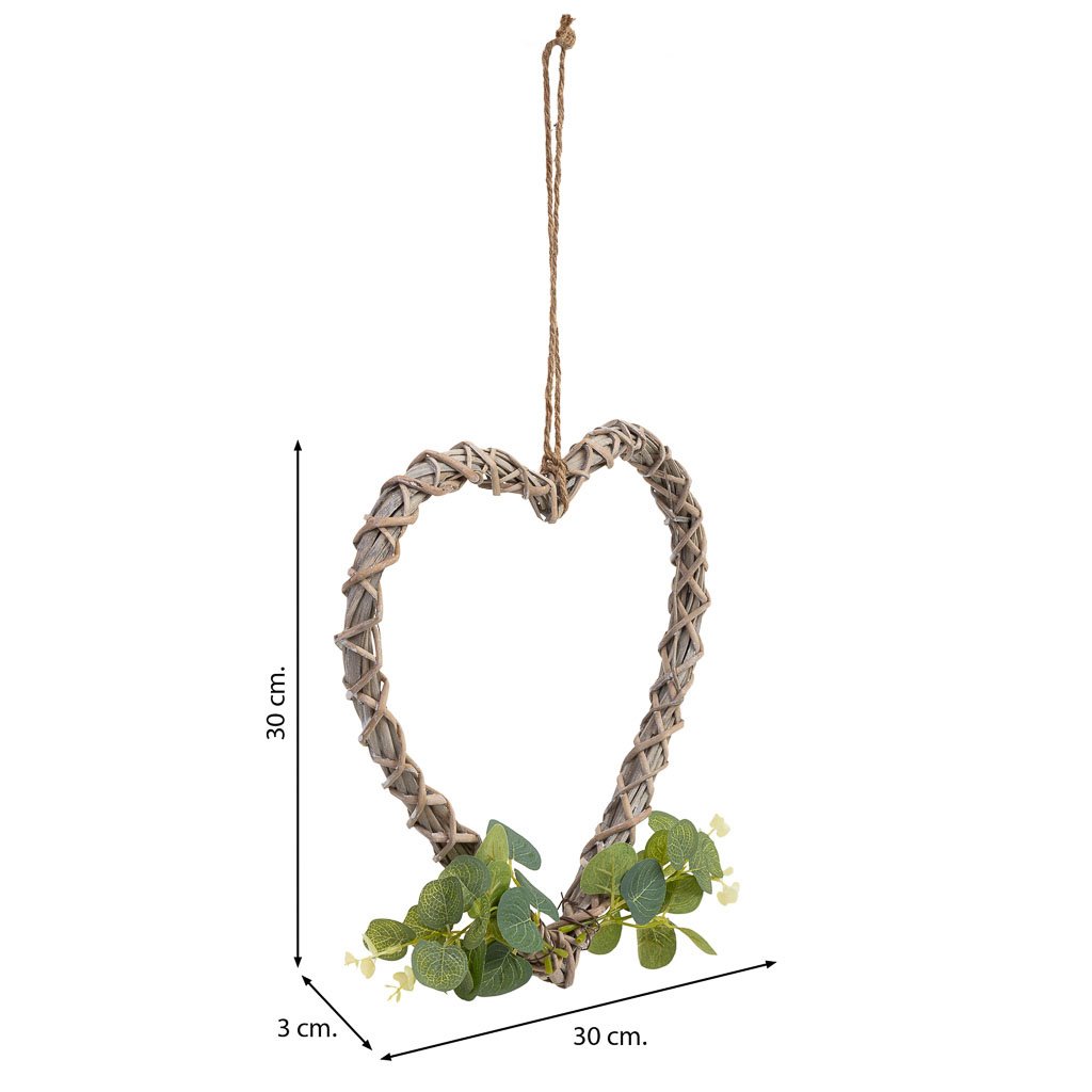 Este corazón decorativo de mimbre tiene unas medidas de 30 cm de largo, 30 cm de ancho y 3 cm de altura. Decorado con flores, es perfecto para colgar y aportar un toque romántico y cálido a cualquier habitación.