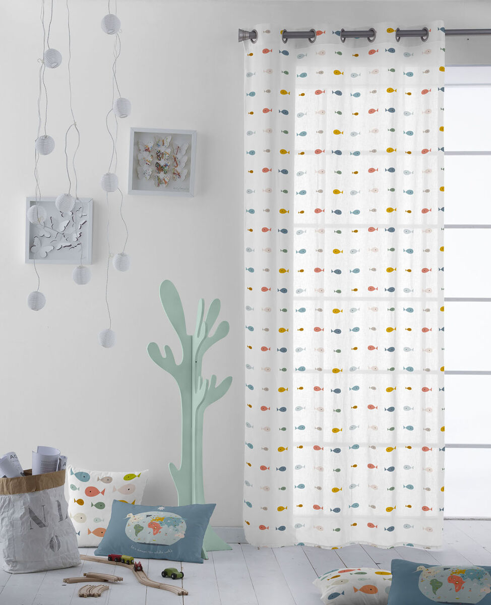 Cortina de interior con tejido de algodón suave y fácil de lavar. Diseñada para colocar en una barra mediante 8 ollaos metálicos. Confeccionada con dobladillo