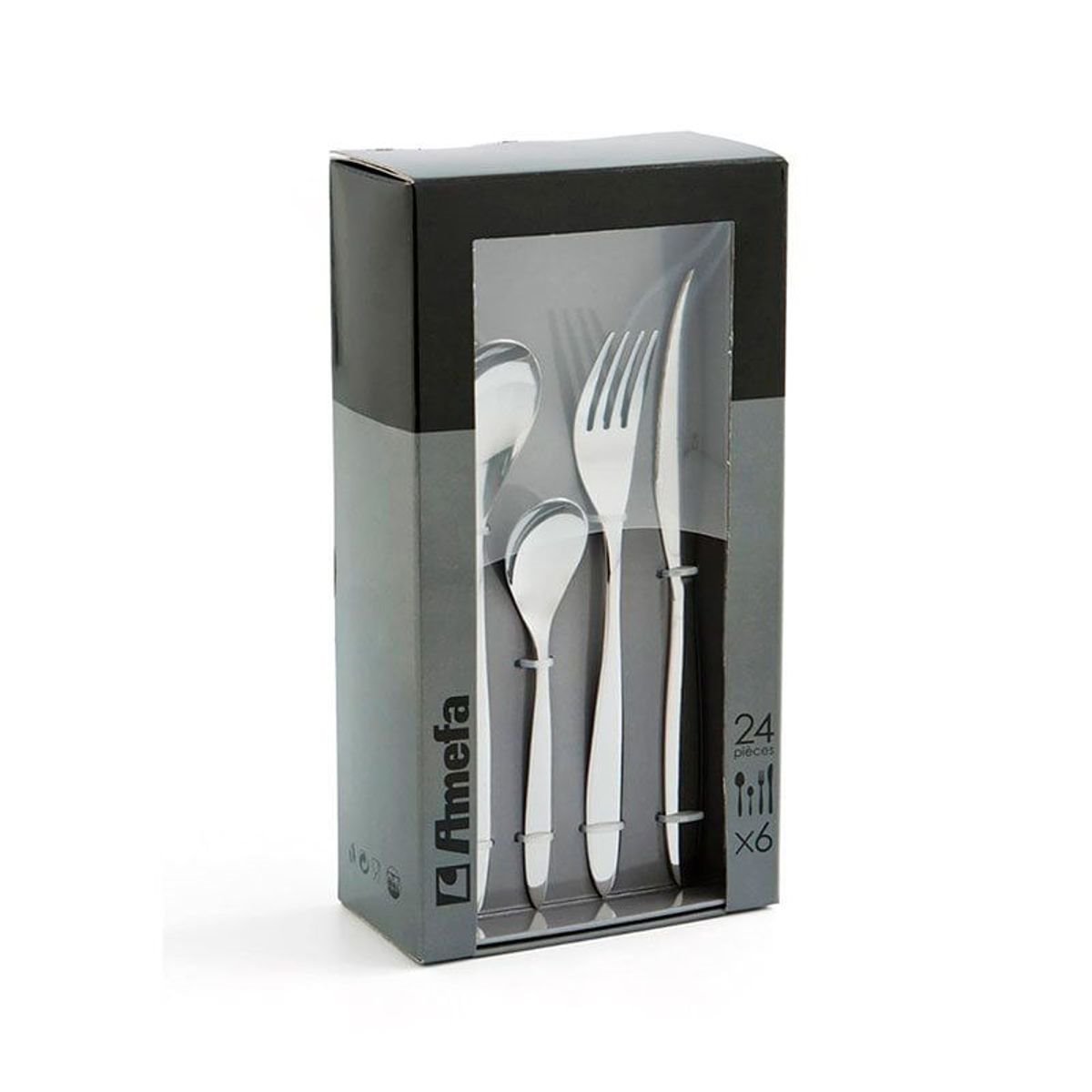 La cubertería modelo Actual de la marca Amefa cuenta con 24 piezas fabricadas en acero inoxidable ideales para el uso cotidiano. Viene con 6 tenedores, 6 cucharas, 6 cuchillos y 6 cucharillas de café. Para un uso duradero te recomendamos lavar y secar todo a mano, aunque las piezas también son aptas para lavavajillas. Si lo que buscas es menaje de cocina de buena calidad esta cubertería es todo lo que estás buscando.