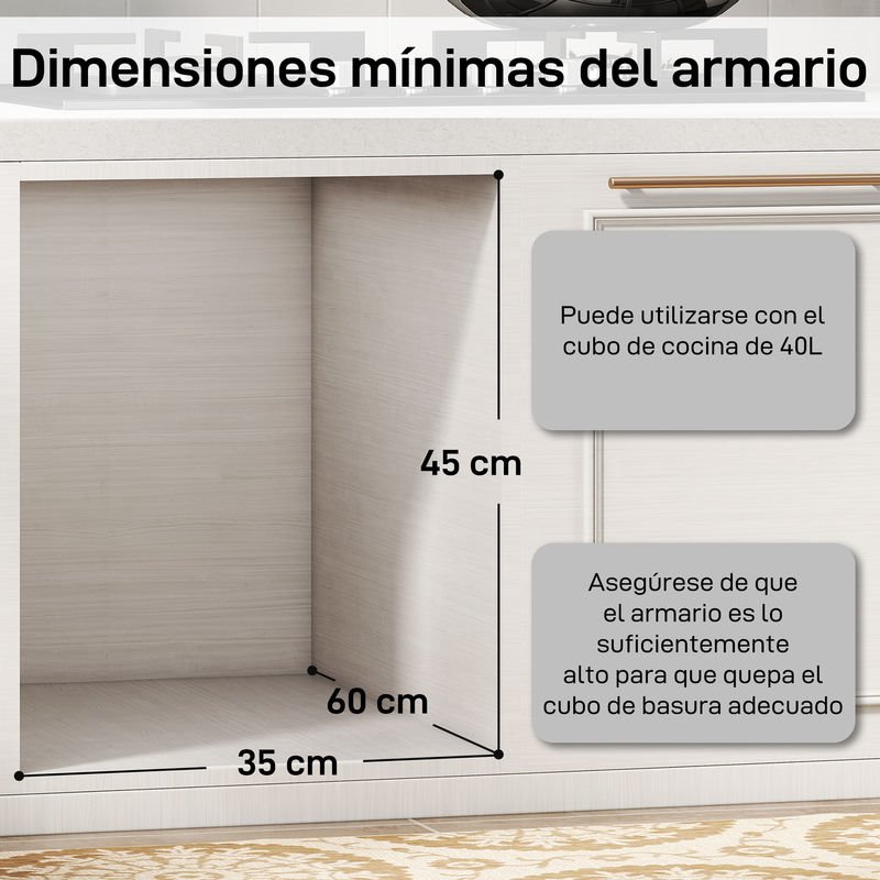 - Este cubo de basura para cocina cuenta con dos compartimentos (20L + 20L), ofreciendo una capacidad total de 40L para separar residuos y reciclaje