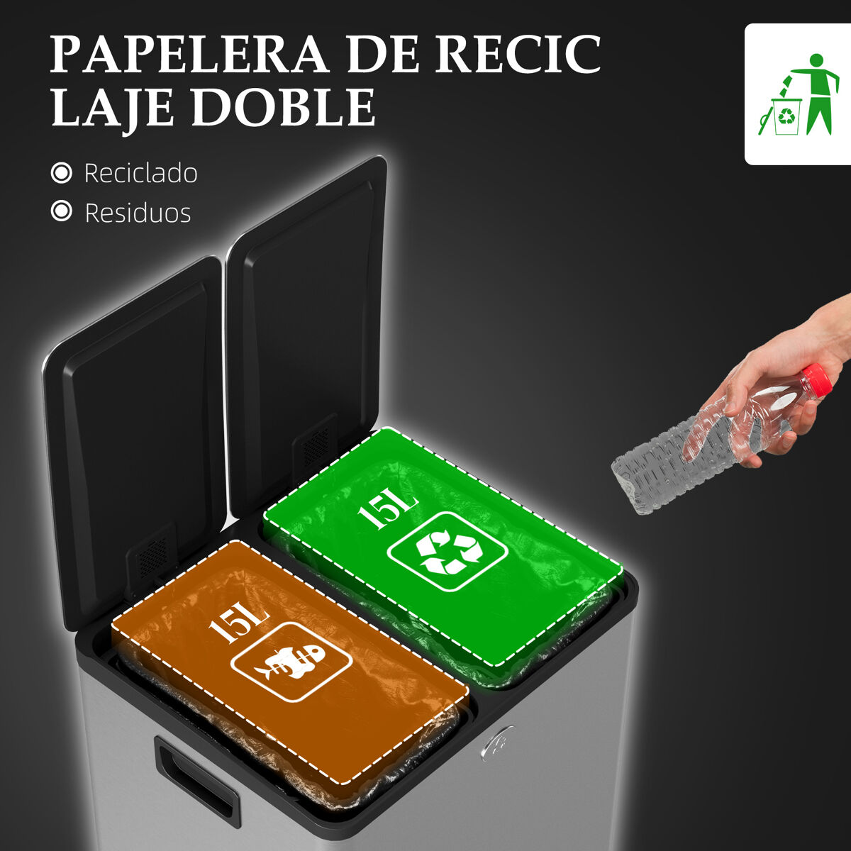 Mantén tu espacio limpio y libre de olores con este cubo de basura de HOMCOM. Esta papelera de cocina incluye dos compartimentos de 15 litros para separar residuos y reciclables. El acabado en acero inoxidable resistente a las manchas garantiza un aspecto siempre limpio. Las tapas de cierre suave y silencioso, junto con los cómodos pedales, hacen que su uso sea mucho más práctico. Además, los cubos internos extraíbles facilitan el cambio de bolsas y la limpieza.