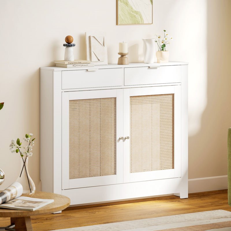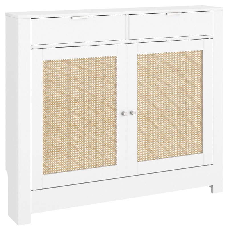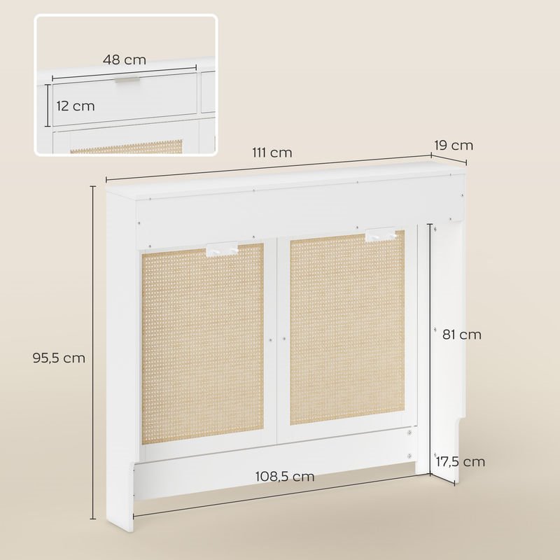 ¿Tu radiador rompe la estética del salón y no sabes cómo integrarlo en la decoración? Con este cubreradiador de HOMCOM no solo lo disimulas, también ganas un mueble práctico. Cuenta con espacio de almacenaje, una balda superior para decorar a tu gusto y dos puertas de mimbre que permiten que el calor circule mientras protege a los más pequeños y a tus mascotas. Una solución funcional con un aire moderno y bohemio que hará tu hogar más acogedor.