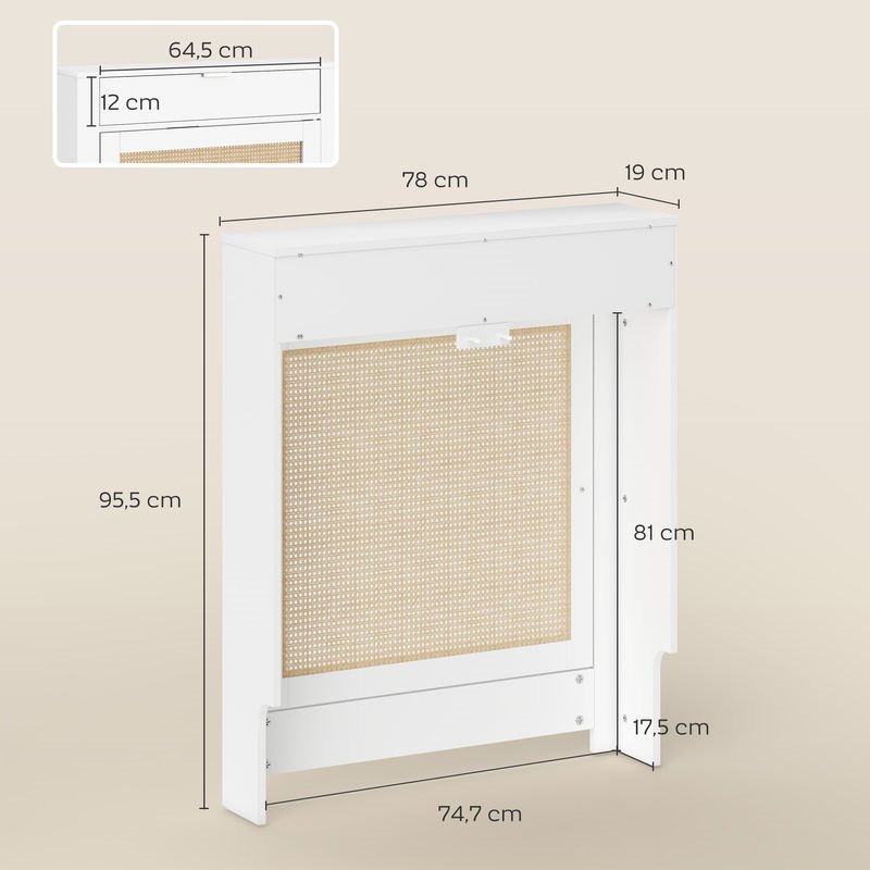 ¿Tu radiador rompe la estética del salón y no sabes cómo integrarlo en la decoración? Con este cubrerradiador de HOMCOM no solo lo disimulas, también ganas un mueble práctico. Cuenta con espacio de almacenaje, una balda superior para decorar a tu gusto y una puerta de mimbre que permite que el calor circule mientras protege a los más pequeños y a tus mascotas. Una solución funcional con un aire moderno y bohemio que hará tu hogar más acogedor.