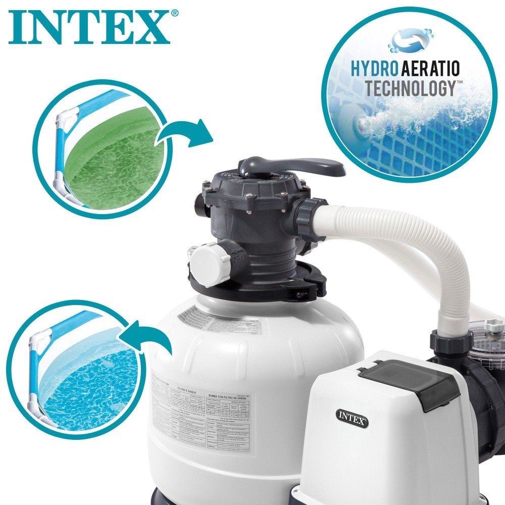 - Sistema de depuración por arena para piscinas de hasta 57.500 litros, capacidad filtración: 10.500 l/h, incorpora el sistema Hydro Aeration System de INTEX