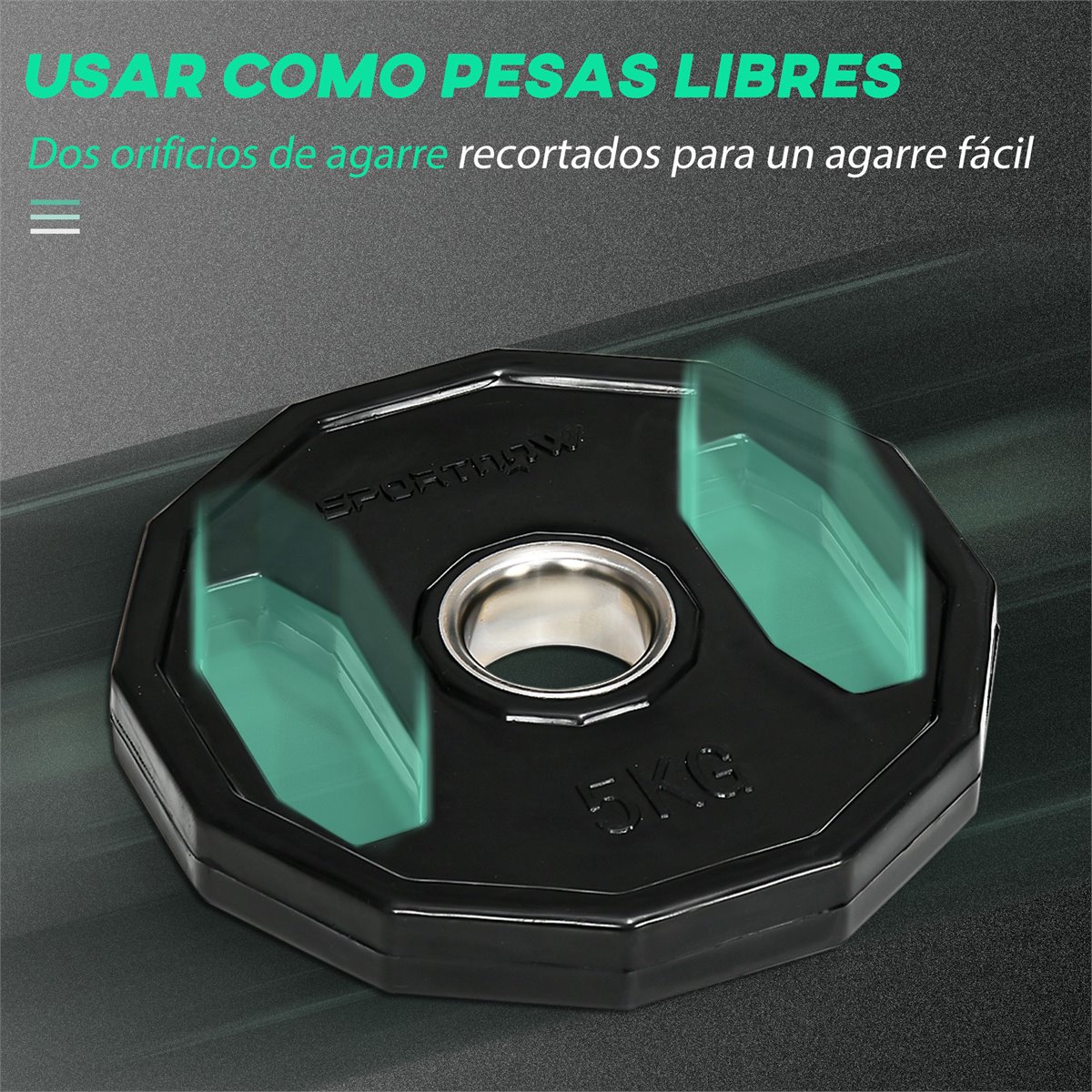 - Tiene un orificio central de Ø5 cm para adaptarse a las barras de pesas
