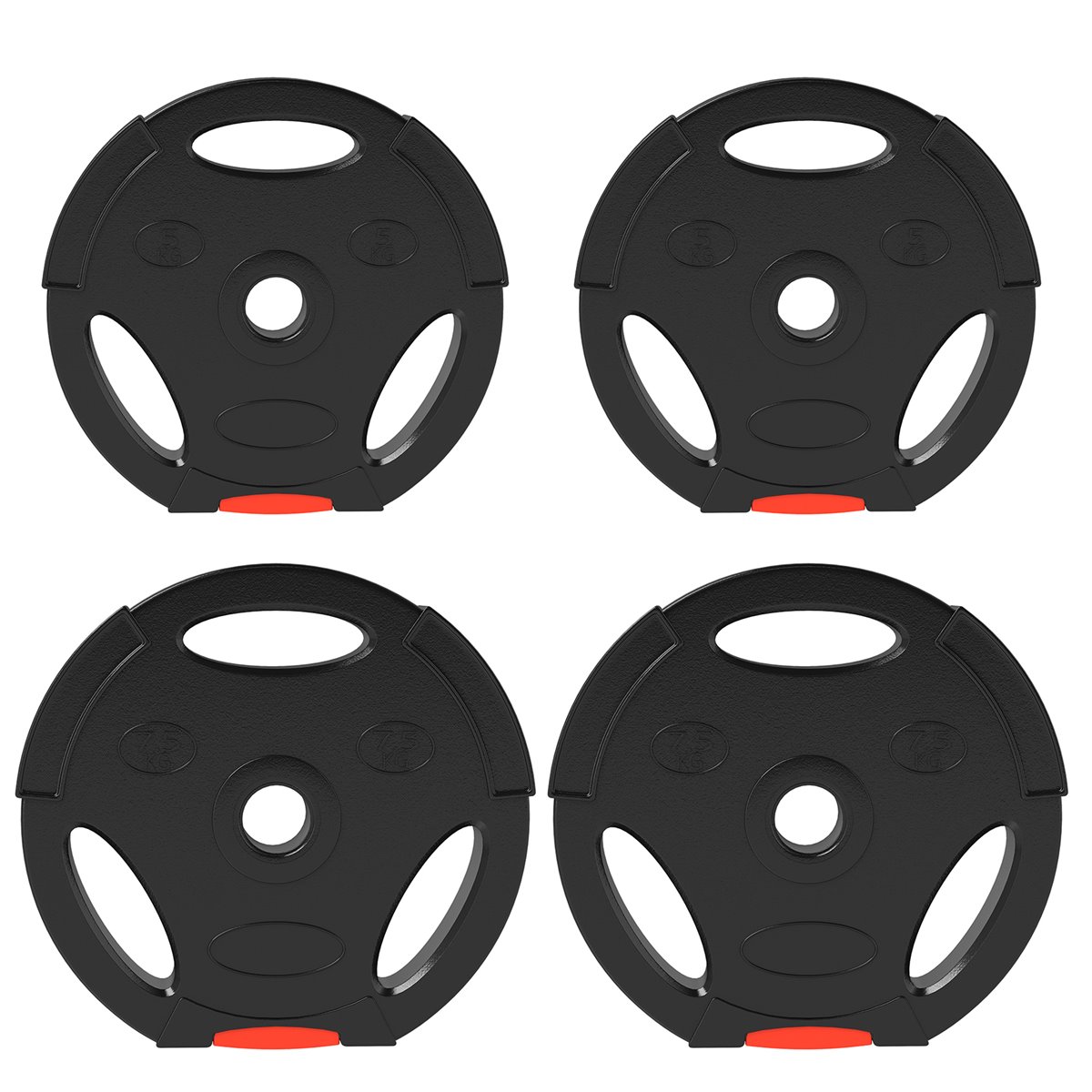 - Cada disco de pesa cuenta con un diseño con tres orificios para un agarre más fácil y seguro durante tus entrenamientos