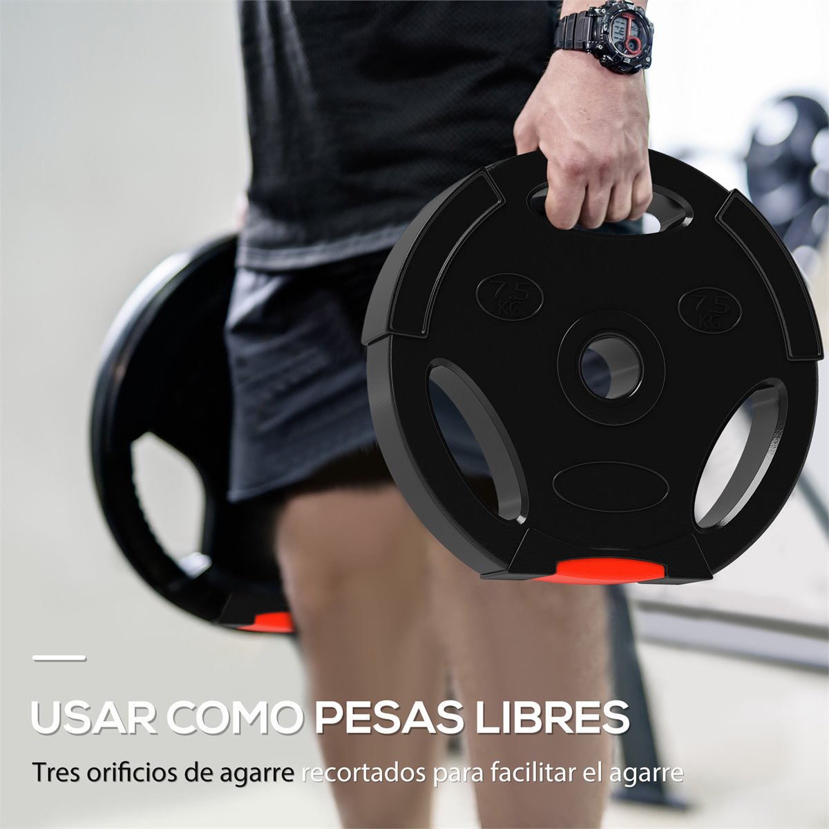 - Tiene un orificio central de Ø2,5 cm para adaptarse a las barras de pesas